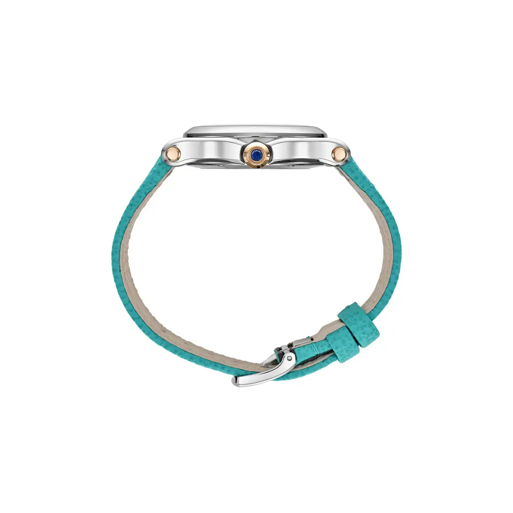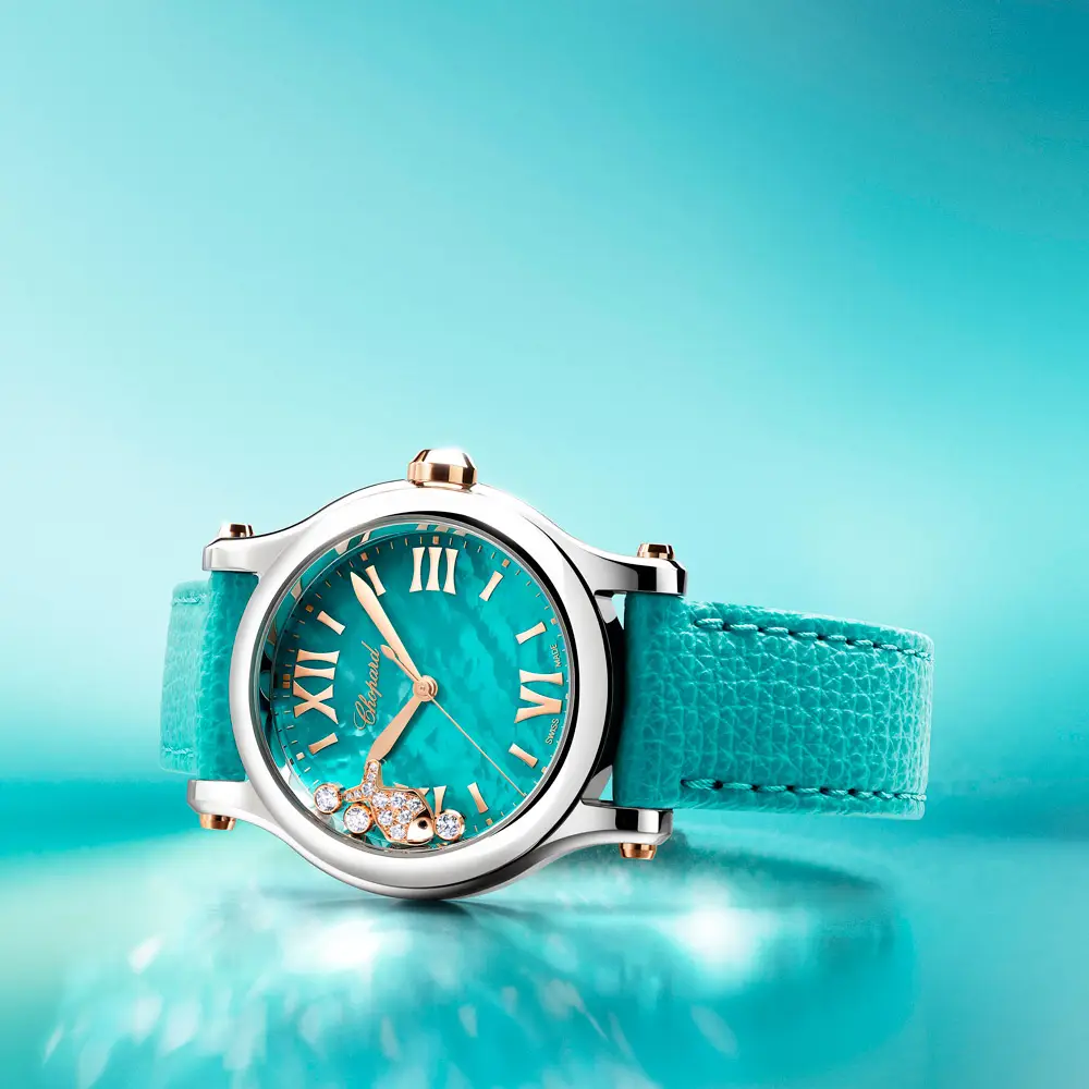 最吸引人的是蓝绿色珍珠贝母表盘,上面漂浮着一条造型独特的金鱼--'快乐的鱼 '图案,并镶嵌着三颗自由移动的钻石和两个蓝宝石元素。这一梦幻般的设计捕捉到了 Happy Diamonds 系列特有的动感和欢乐的幻觉。指针和玫瑰金细节使整体更加和谐。