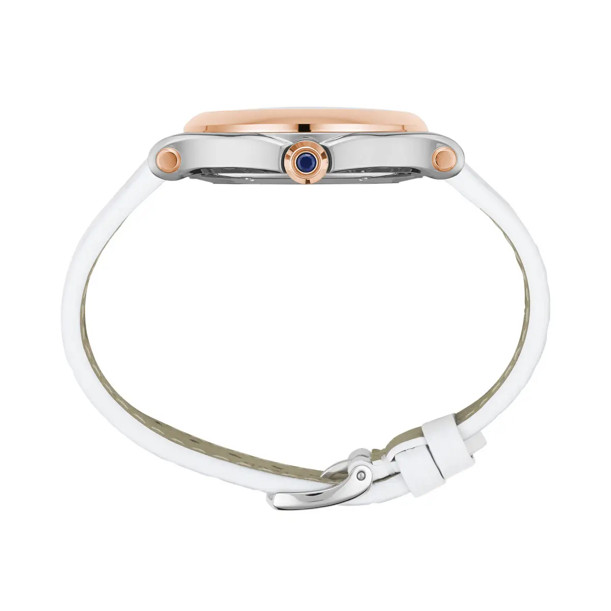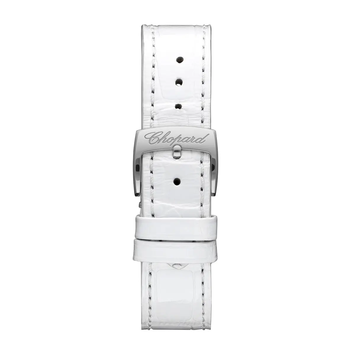 白色鳄鱼皮表带 显得纯净高雅,与玫瑰金色调形成鲜明对比。针式表扣 简约可靠,佩戴稳固。