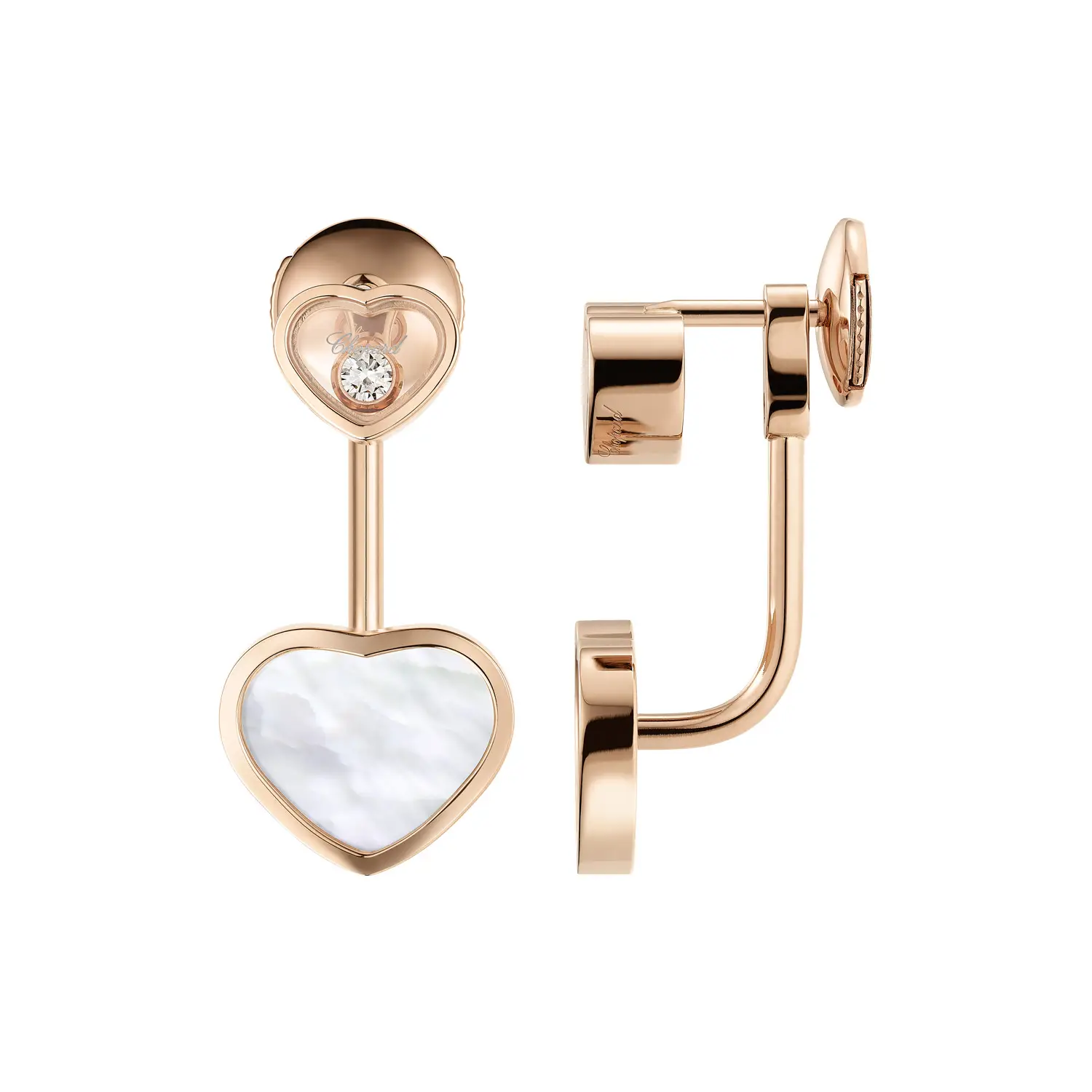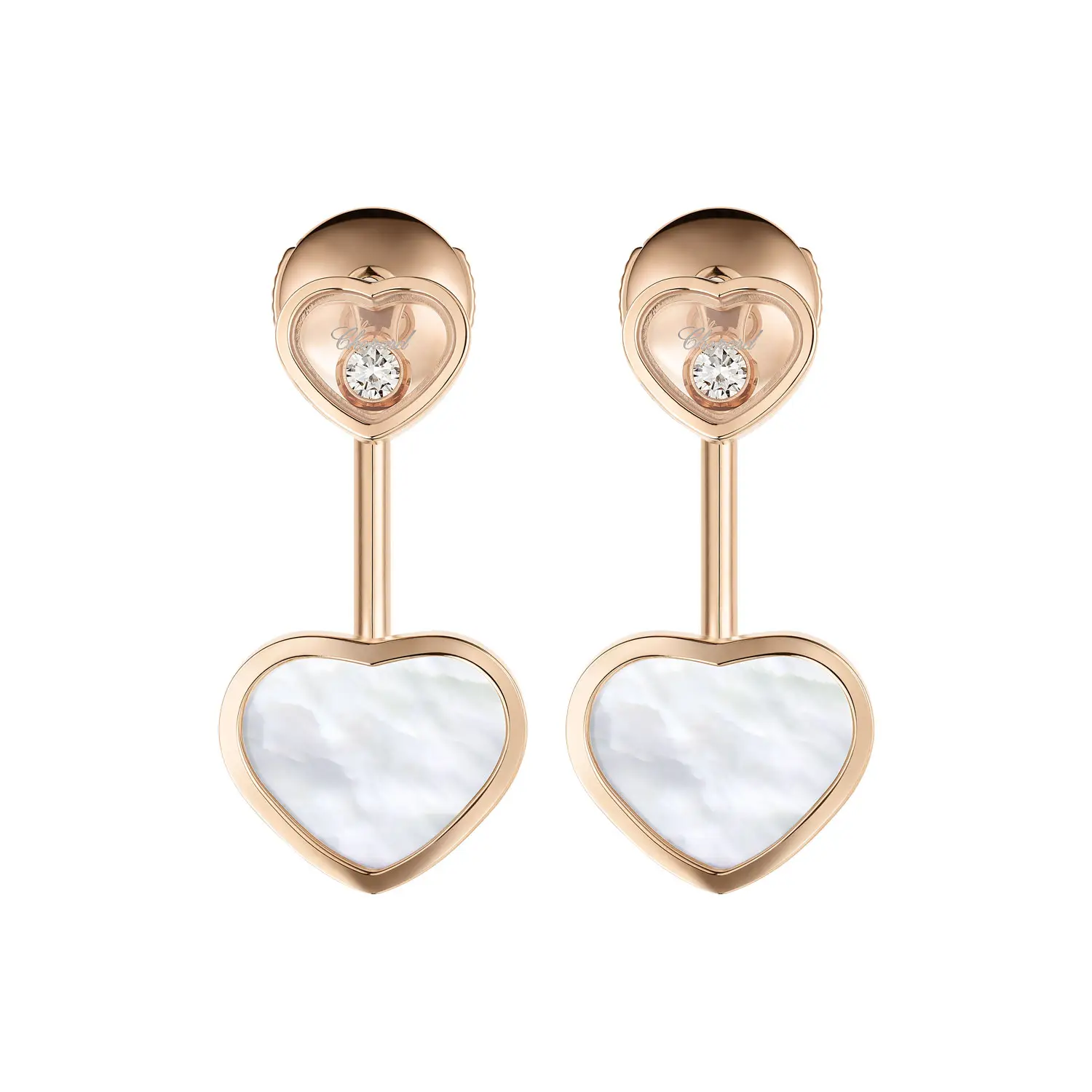 这款 Chopard Happy Hearts 83A082-5301 耳饰完美融合了浪漫与优雅。采用 18K 道德玫瑰金 制作,镶嵌 白色珍珠母贝心形图案 与 明亮式切割钻石(总重约 0.10 克拉),钻石在两片蓝宝石水晶之间灵动闪耀——这是 Happy Hearts 系列的标志性设计,象征 快乐与自由。