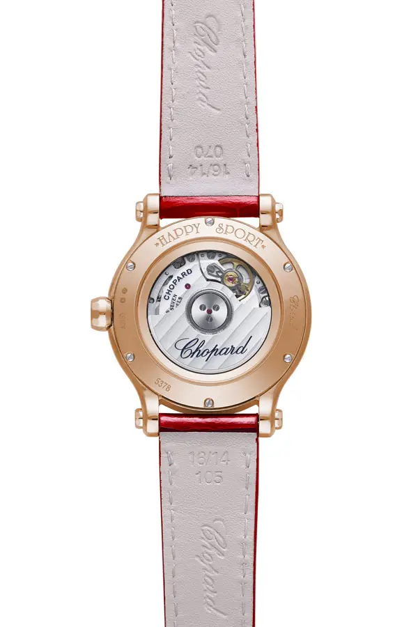 搭载 自动上链机芯 CHOPARD 09.01-C,具备 约 42 小时动力储存 和 27 颗宝石轴承,以卓越精准著称。透明表背 展示精美机芯装饰。具备 30 米防水性能,此腕表诠释了 女性柔美、优雅与瑞士完美工艺 的融合。Chopard Happy Sport 275378-5005 不仅是一枚腕表,更是一件 象征热情与独立魅力的珠宝艺术品。