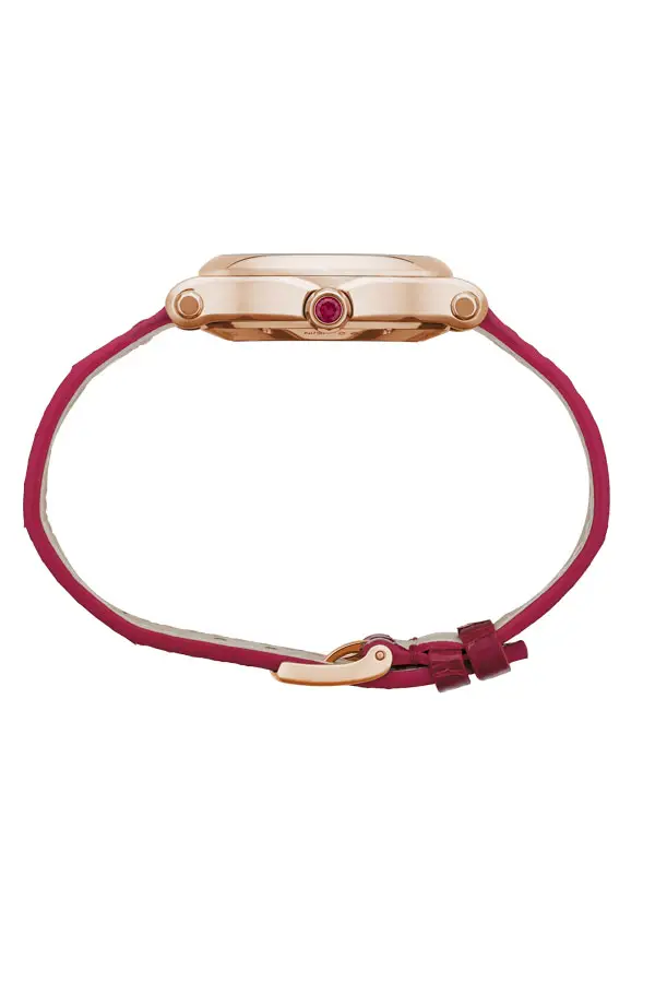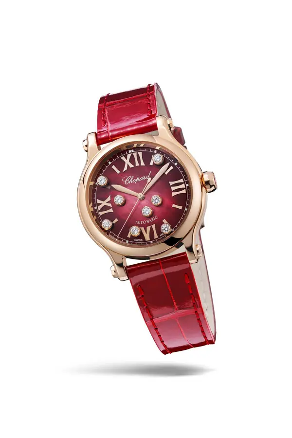 腕表采用 33 毫米 18K 玫瑰金表壳,搭配 红色表盘,饰以 罗马数字 与 八颗自由滑动钻石,它们在两层蓝宝石水晶之间优雅舞动,闪烁耀眼光芒。防眩蓝宝石镜面 提供清晰视野与防刮保护,而 红色鳄鱼皮表带 配针扣设计,尽显高贵气质。