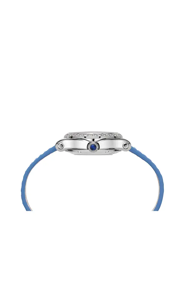 30 毫米圆形表壳 由 抛光不锈钢 打造,搭配 镶钻表圈,闪耀迷人光彩。蓝宝石水晶玻璃 覆盖 蓝色钻石表盘,多颗 灵动钻石 自由滑动于两层玻璃之间,每一个手腕动作都带来璀璨光影的舞动。
