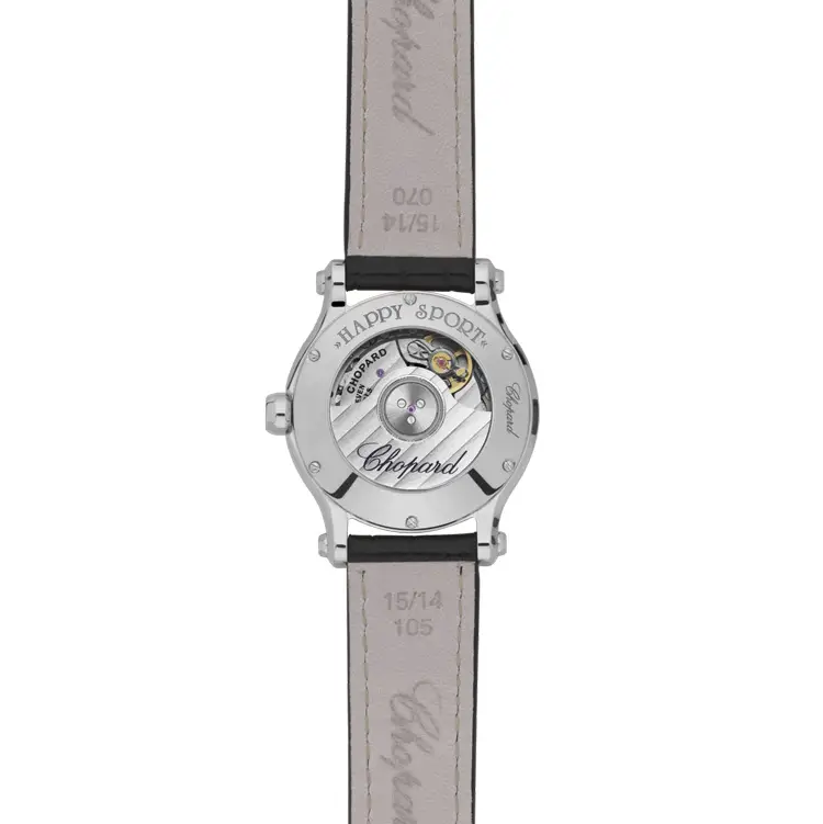 30 毫米抛光精钢表壳 优雅而自信,防刮蓝宝石水晶镜面 保护表盘,30 米防水性能 适合日常佩戴。银色表盘 上的 自由滑动钻石 在两层蓝宝石水晶之间灵动闪耀,展现 迷人的光影舞动——这正是 Happy Sport 系列的标志。