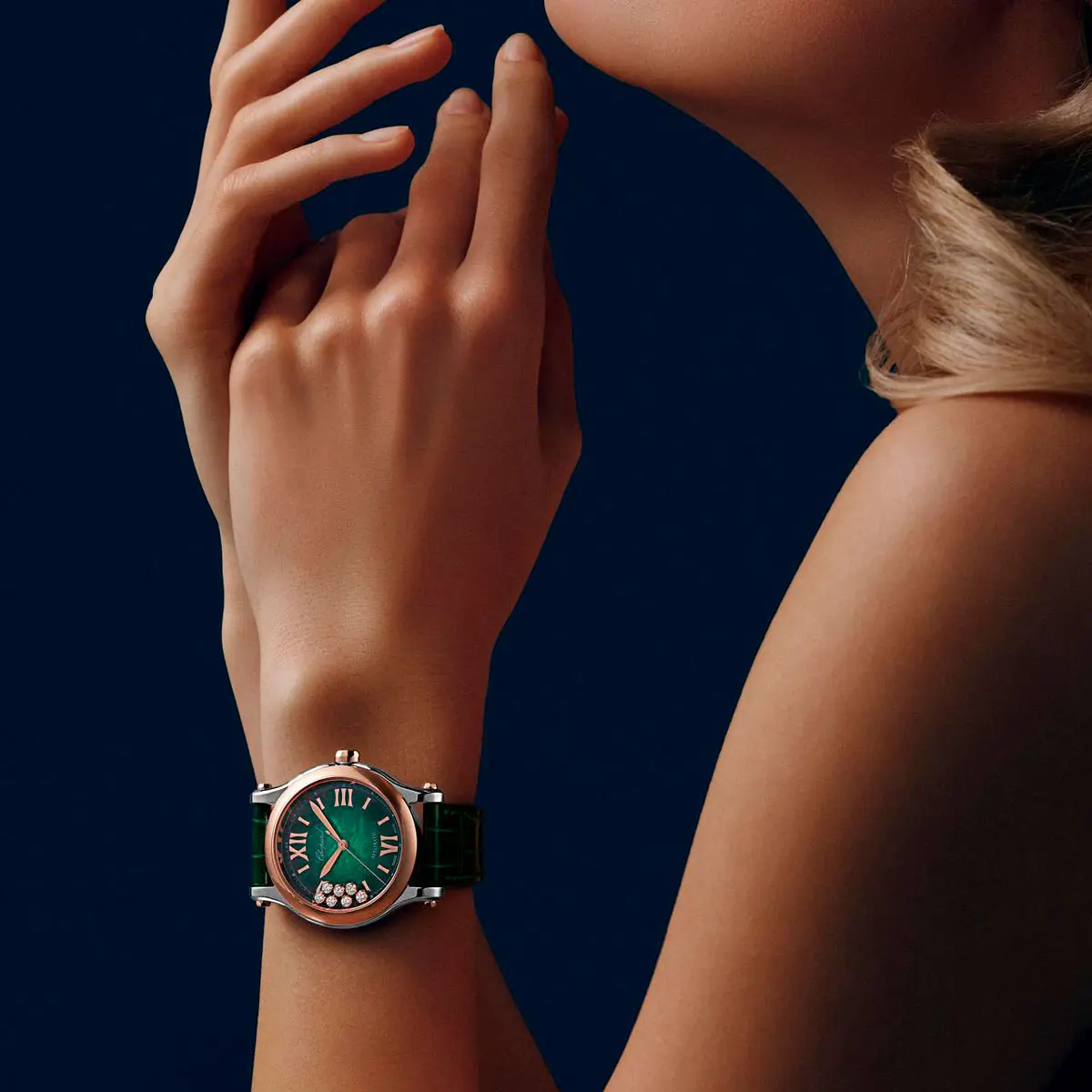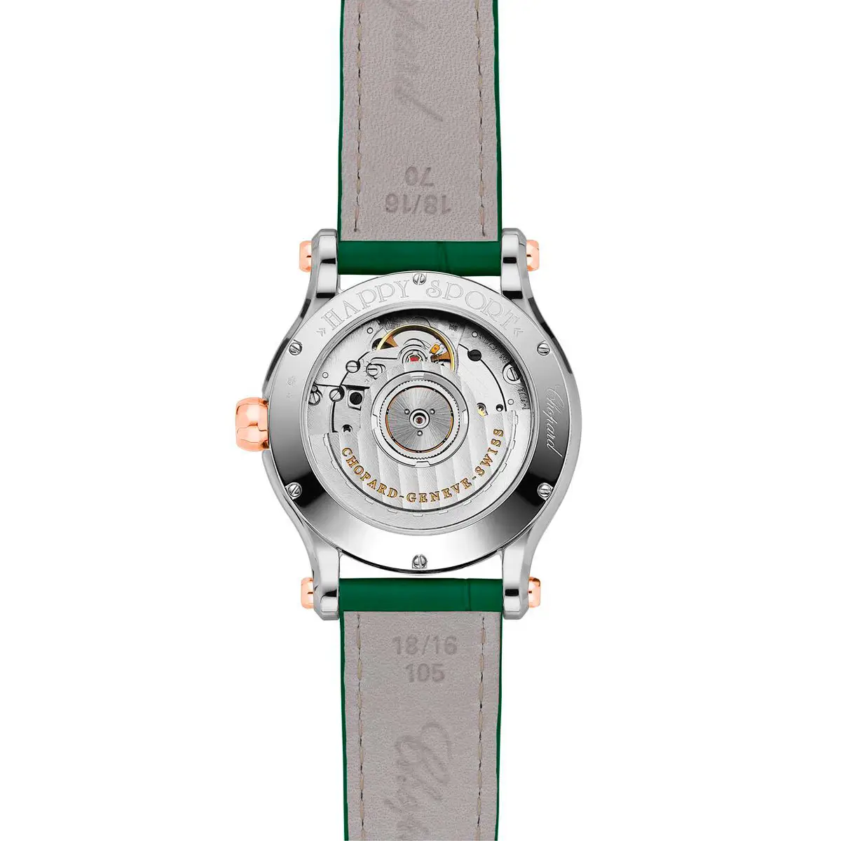 Chopard Happy Sport 278578-6002 展現女性優雅、自信與自然氣質。深綠色調結合18K玫瑰金細節,演繹沉穩與高貴的完美融合。