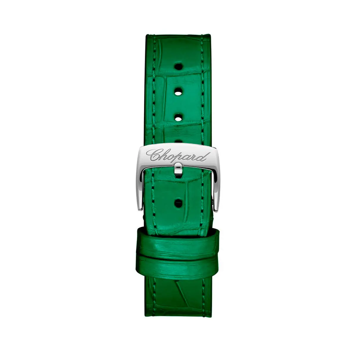 綠色珍珠母貝錶盤上鑲有自由移動的鑽石,捕捉光影流動的瞬間。鱷魚皮錶帶同樣選用綠色調,搭配針扣式錶扣,展現高雅格調。