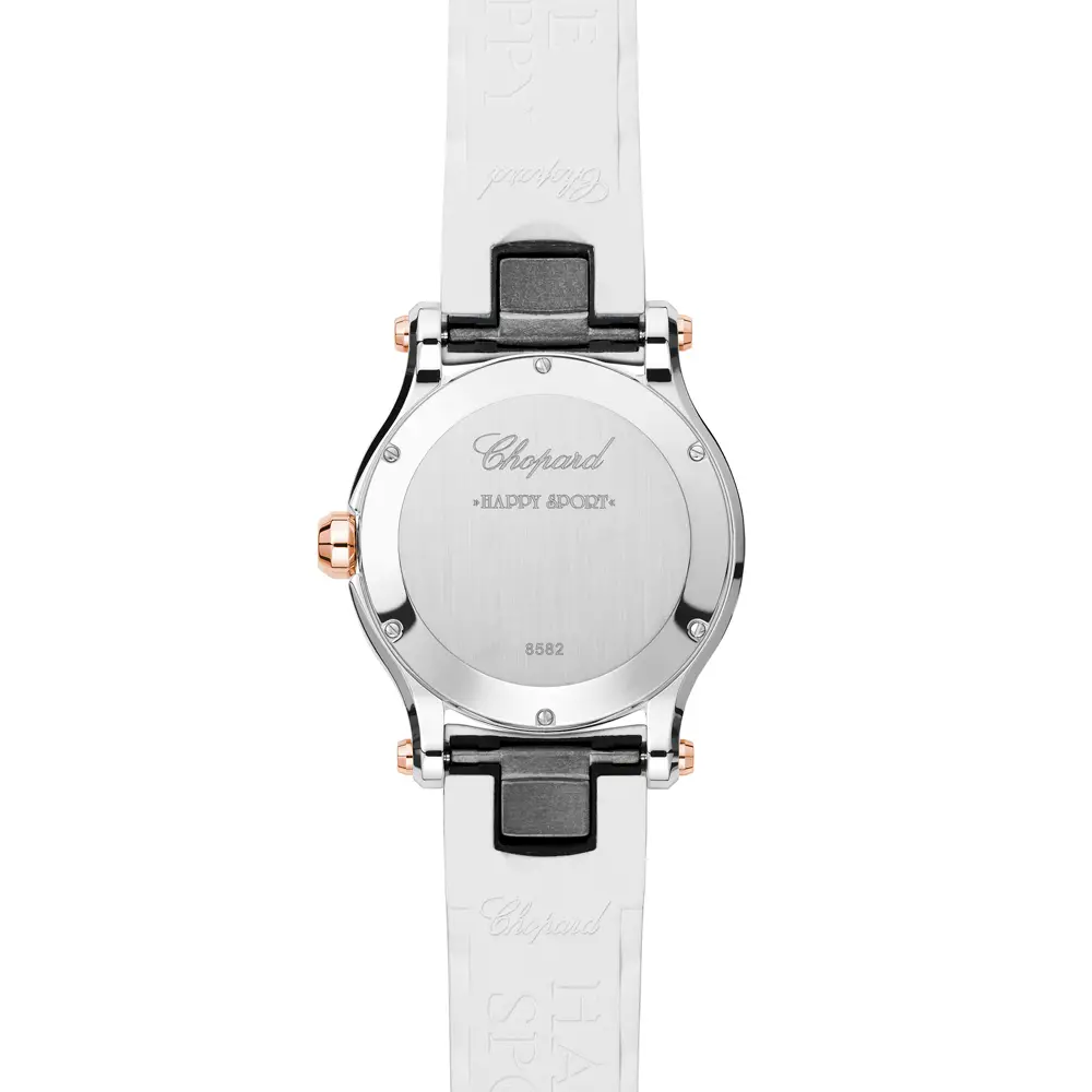 Chopard Happy Sport 278582-6001 诠释了 清新、奢华与优雅的活力——为热爱风格与轻盈格调的女性打造。来自 Happy Sport 系列 的这款腕表,融合 精钢与 18K 玫瑰金,以纯净 白色设计 和品牌标志性的 灵动钻石 展现欢乐与自由。
