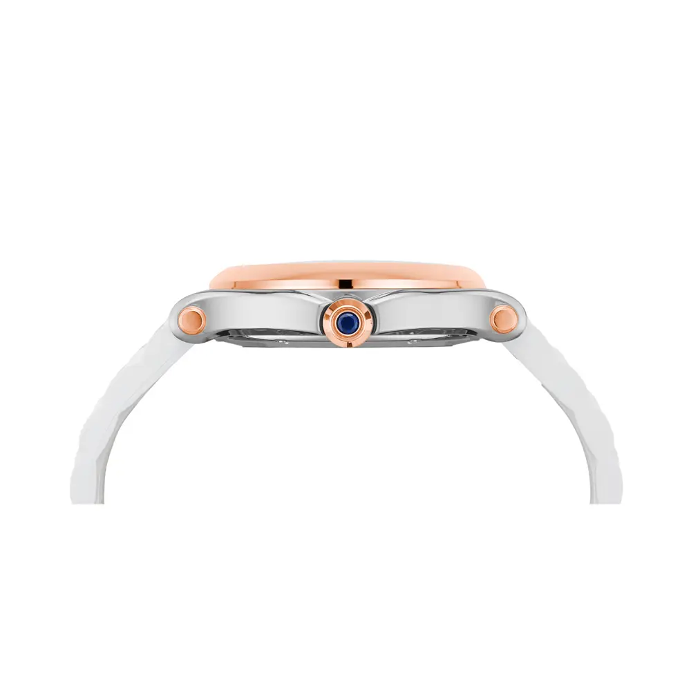 36 毫米表壳 采用 精钢与 18K 玫瑰金表圈 的对比设计,增添柔和奢华感。防刮蓝宝石水晶镜面 保护着优雅的 白色表盘,三颗 自由滑动的钻石 在两层蓝宝石之间闪耀起舞。具备 30 米防水性能,适合日常佩戴。