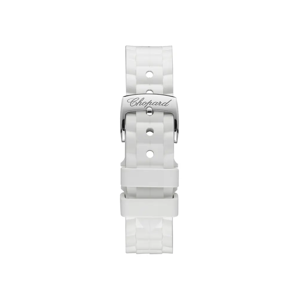 腕表搭载 瑞士石英机芯,精准可靠且无需上链。白色橡胶表带 兼具现代与运动气息,针扣式表扣 舒适稳固。Chopard Happy Sport 278582-6001 不仅是一枚腕表,更是 象征欢乐、女性魅力与自由精神的珠宝艺术品。