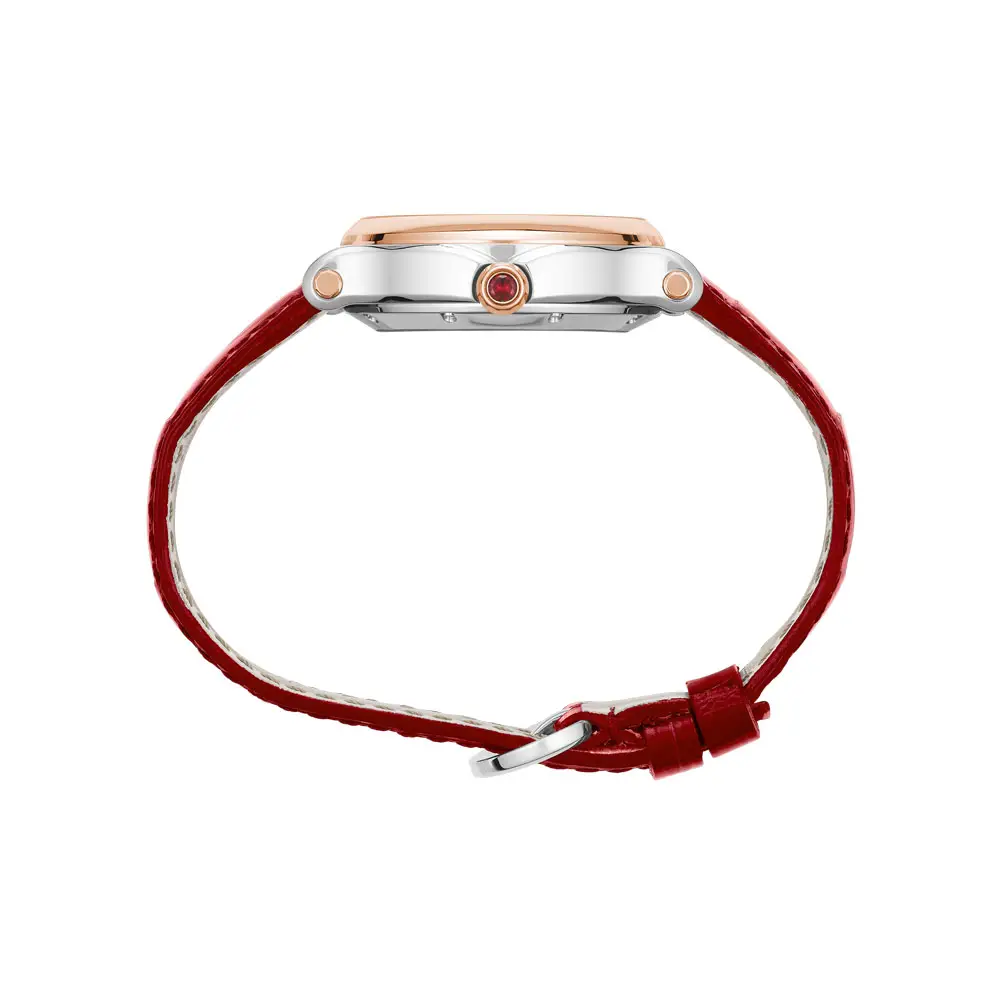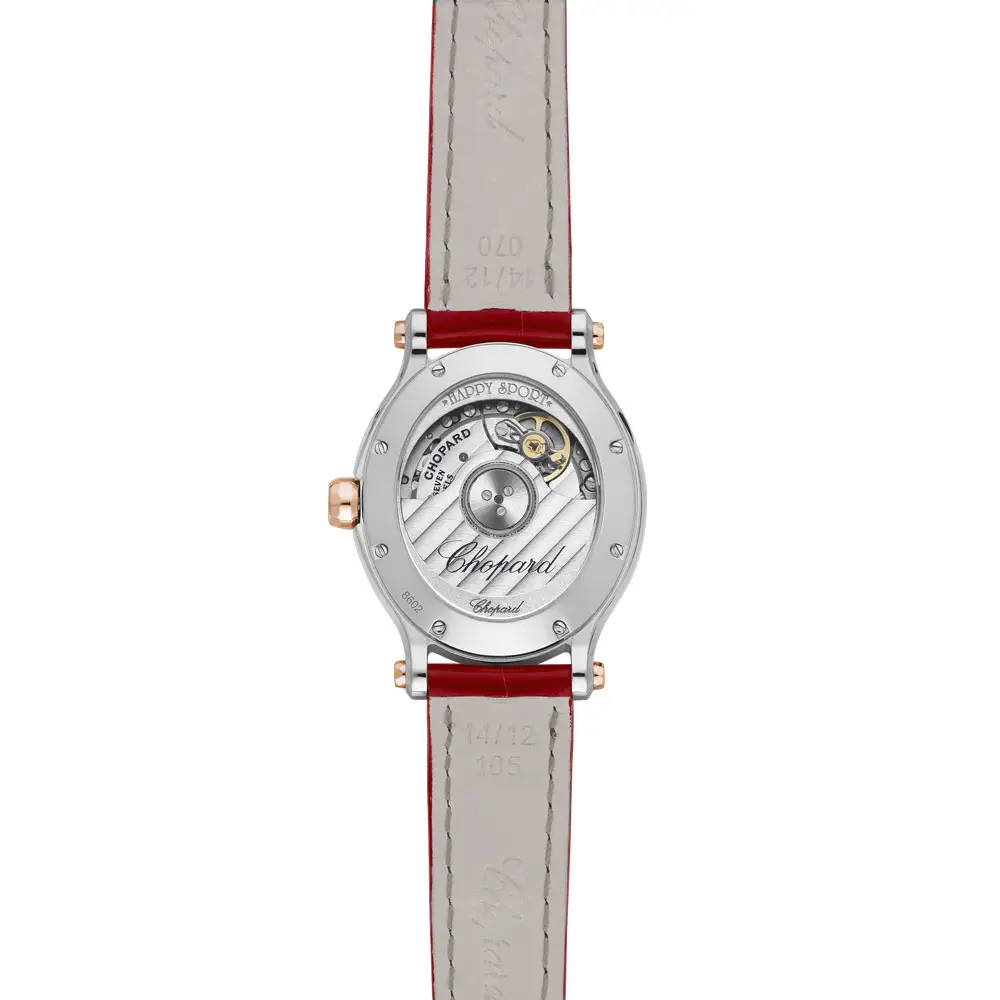 萧邦Happy Sport 278602-6006腕表以优雅的酒红色调体现女性的优雅。29 x 31 毫米的圆形椭圆表壳由不锈钢和 18K 玫瑰金制成,精致而奢华。深酒红色表盘上的七颗钻石恣意飞舞,俏皮的细节是整个Happy Sport系列的标志性特征。