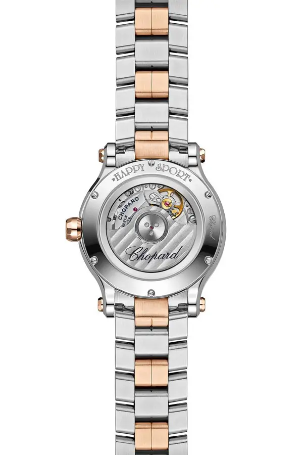 Chopard Happy Sport 278608-6002 將 不鏽鋼 與 18K玫瑰金 完美結合,展現 33 毫米圓形錶殼的柔美魅力。