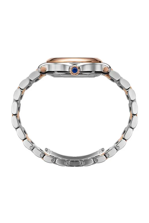 玫瑰金錶圈搭配銀色錶盤與標誌性的自由移動鑽石,每次手腕擺動都閃爍動人。藍寶石水晶玻璃耐刮耐磨,雙色錶帶配摺疊式錶扣佩戴舒適穩固。