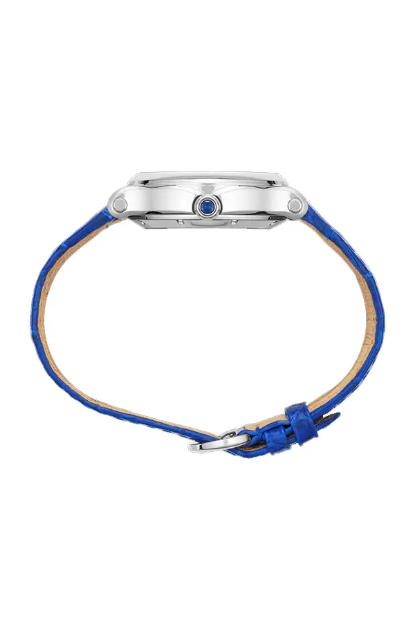 蓝色鳄鱼皮表带为整体设计注入亮丽细节,而传统针扣设计保证佩戴的舒适与稳固。