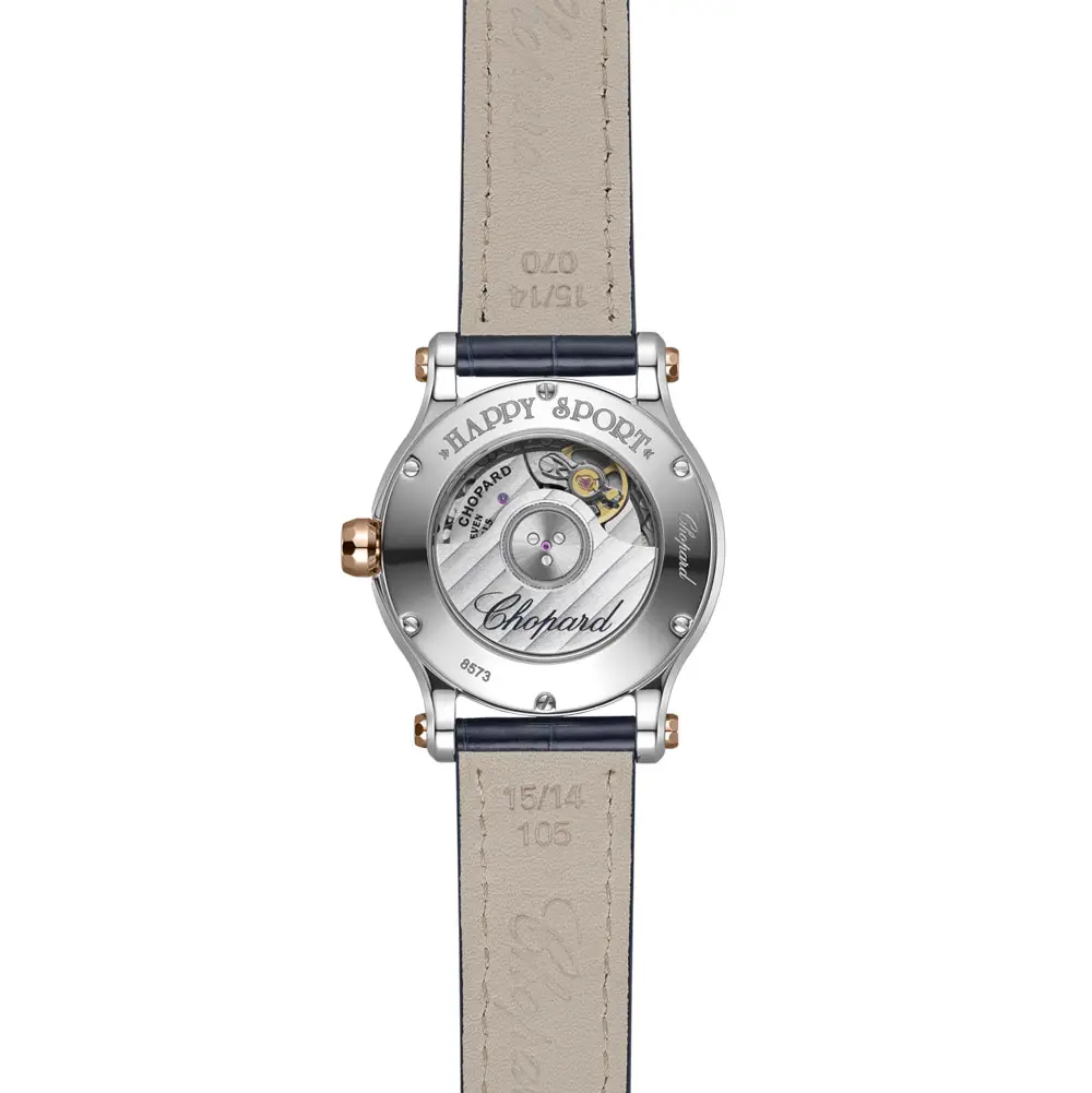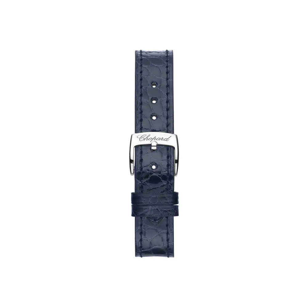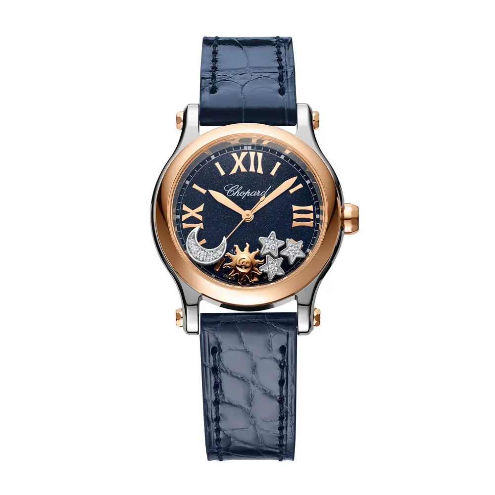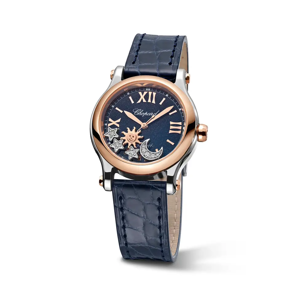 搭配 蓝色鳄鱼皮表带 与经典针扣设计,佩戴舒适且典雅。内部搭载 瑞士自动机械机芯,保证 精准走时与顺畅运转。Chopard Happy Sport Sun, Moon and Stars 278573-6027 不仅是一枚腕表,更是一件 灵感源自星空的诗意珠宝,象征女性的 优雅与无尽光辉。