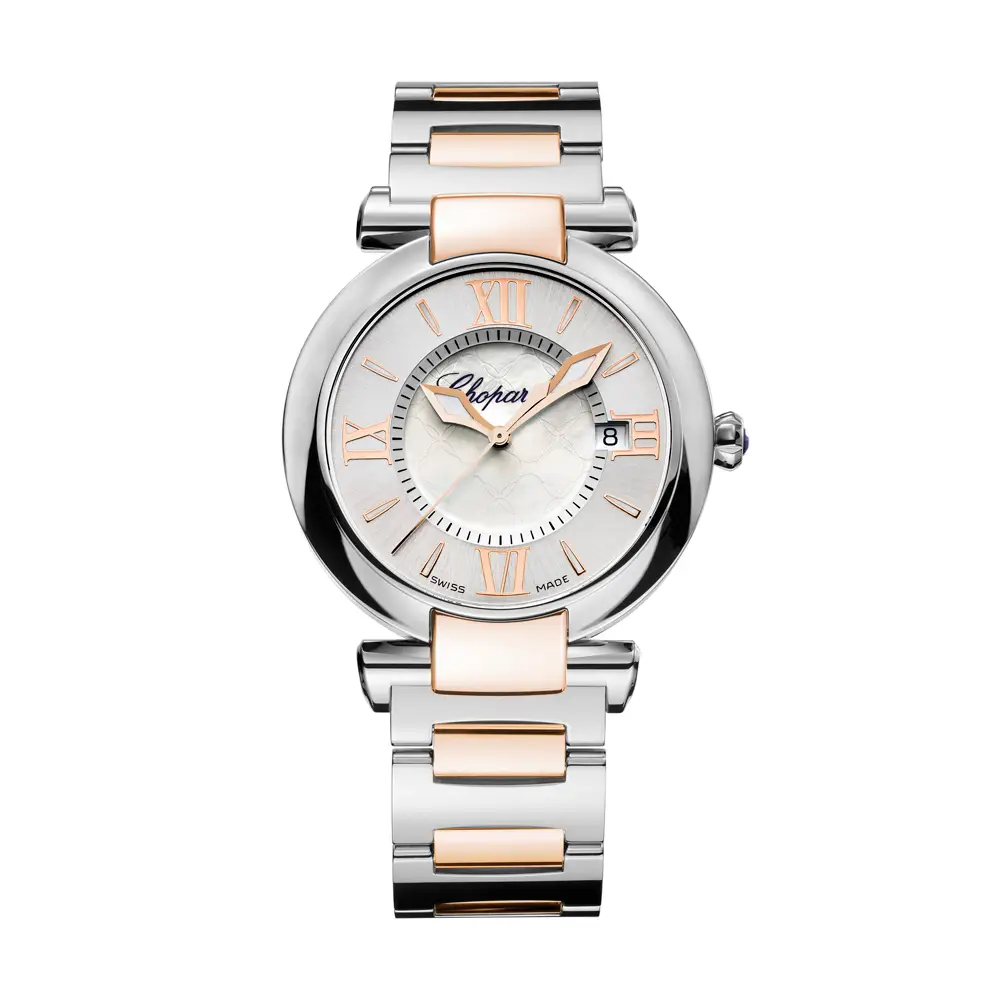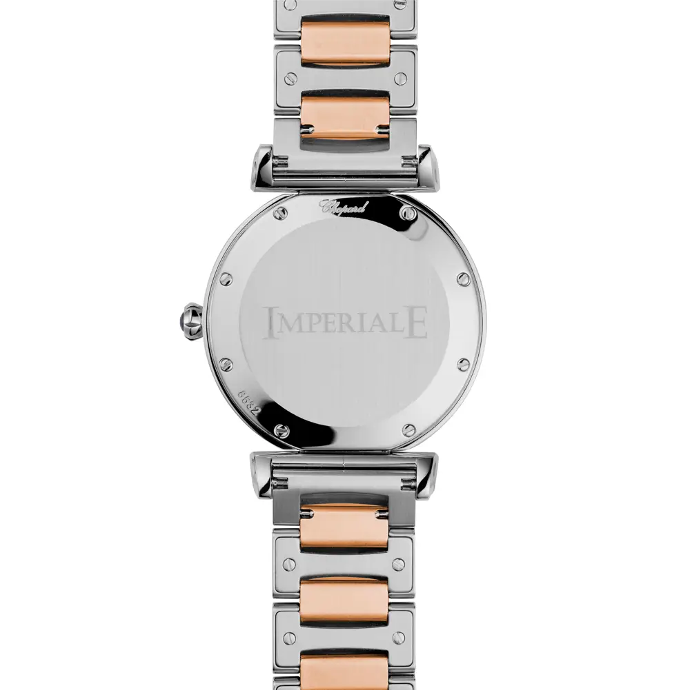 Chopard Imperiale 388532-6002 诠释了 经典优雅、女性柔美与瑞士精密制表 的完美融合。来自 Imperiale 系列的这款腕表,结合 精钢与18K玫瑰金细节,展现出温润与奢华并存的气质。
