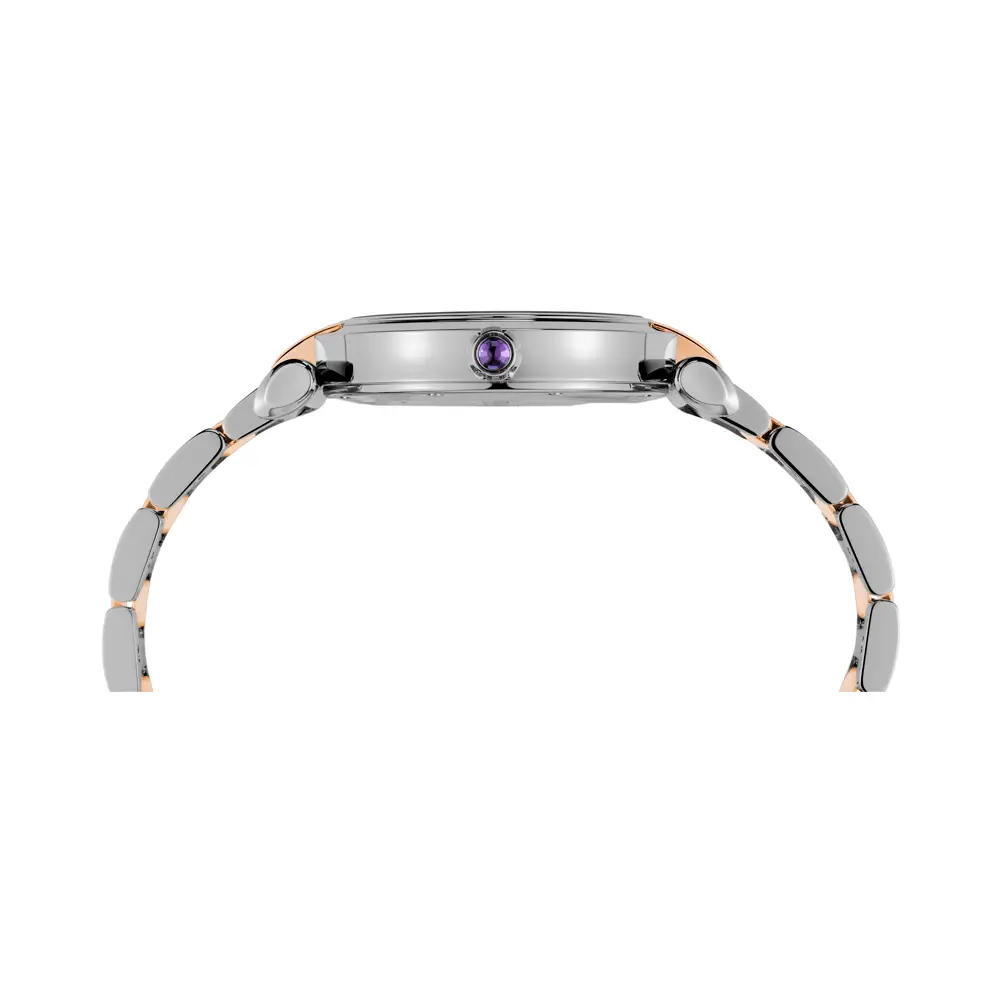 36毫米抛光精钢表壳 配以 防刮擦蓝宝石水晶镜面,保护 珍珠母贝表盘,其上点缀 罗马数字与纤细刻度,彰显纯粹优雅。表冠镶嵌标志性的 紫水晶圆形宝石,象征 Imperiale 系列的皇室风范。