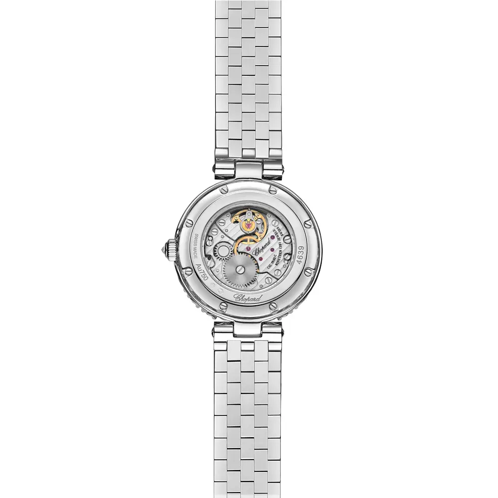 腕表搭载 萧邦手动上链机芯 Calibre 10.01-C,拥有 约 45 小时动力储存。珍珠母贝表盘随光线变幻色彩,白金表冠与指针进一步凸显其高贵质感。搭配 防反光蓝宝石水晶镜面 与 30 米防水性能,兼具精致与可靠。