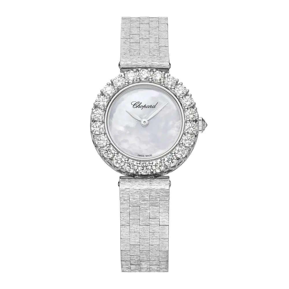 萧邦 Chopard L'Heure du Diamant Round 10A178-1301 完美融合了高级珠宝艺术与瑞士制表工艺。表壳直径为 26 毫米,由 18K 道德白金打造,外圈镶嵌 总重 2.23 克拉的璀璨钻石,展现出典雅、柔美与永恒光彩的完美结合。