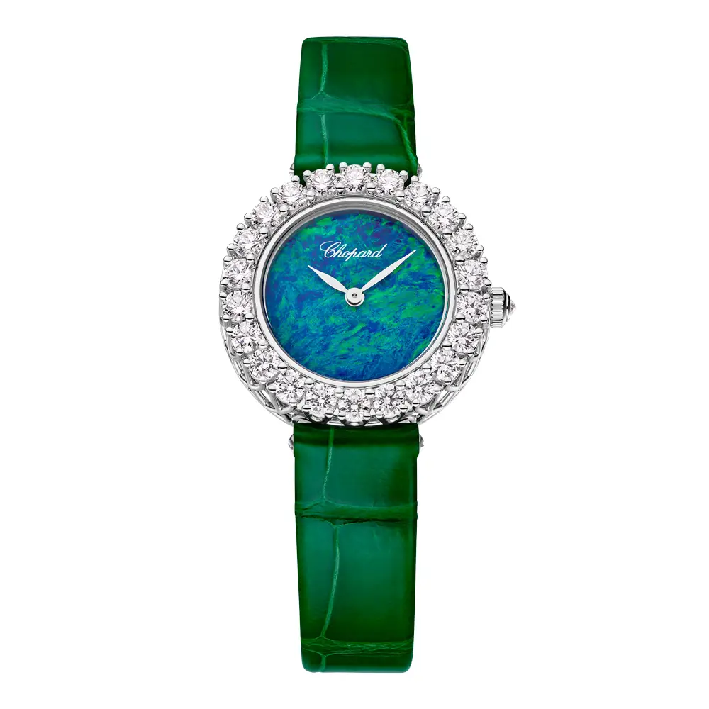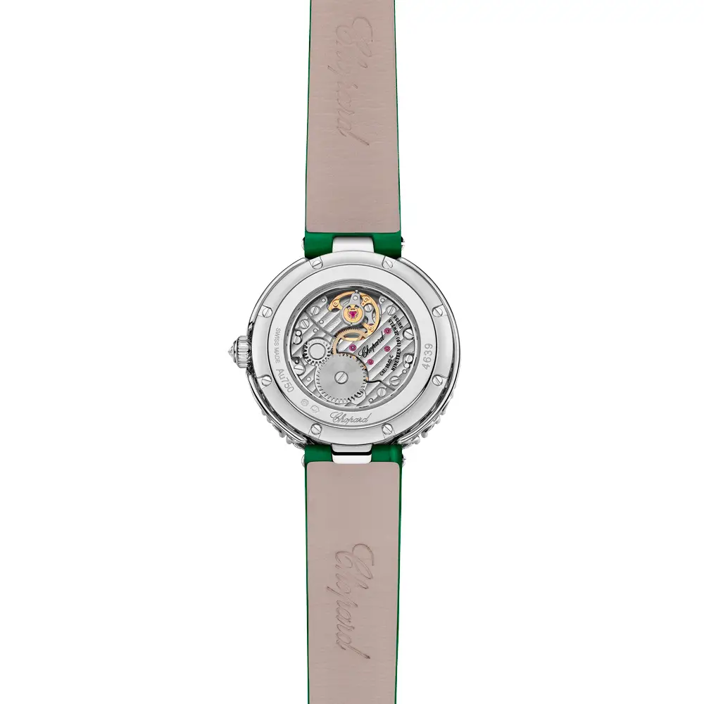 腕表搭载 萧邦手动上链机芯 Calibre 10.01-C,拥有 约 45 小时动力储存,精准可靠。珍珠母贝表盘随光线变化呈现柔和色泽,搭配 防反光蓝宝石水晶镜面,读时清晰无阻。具备 30 米防水性能,兼顾日常佩戴与精致美感。