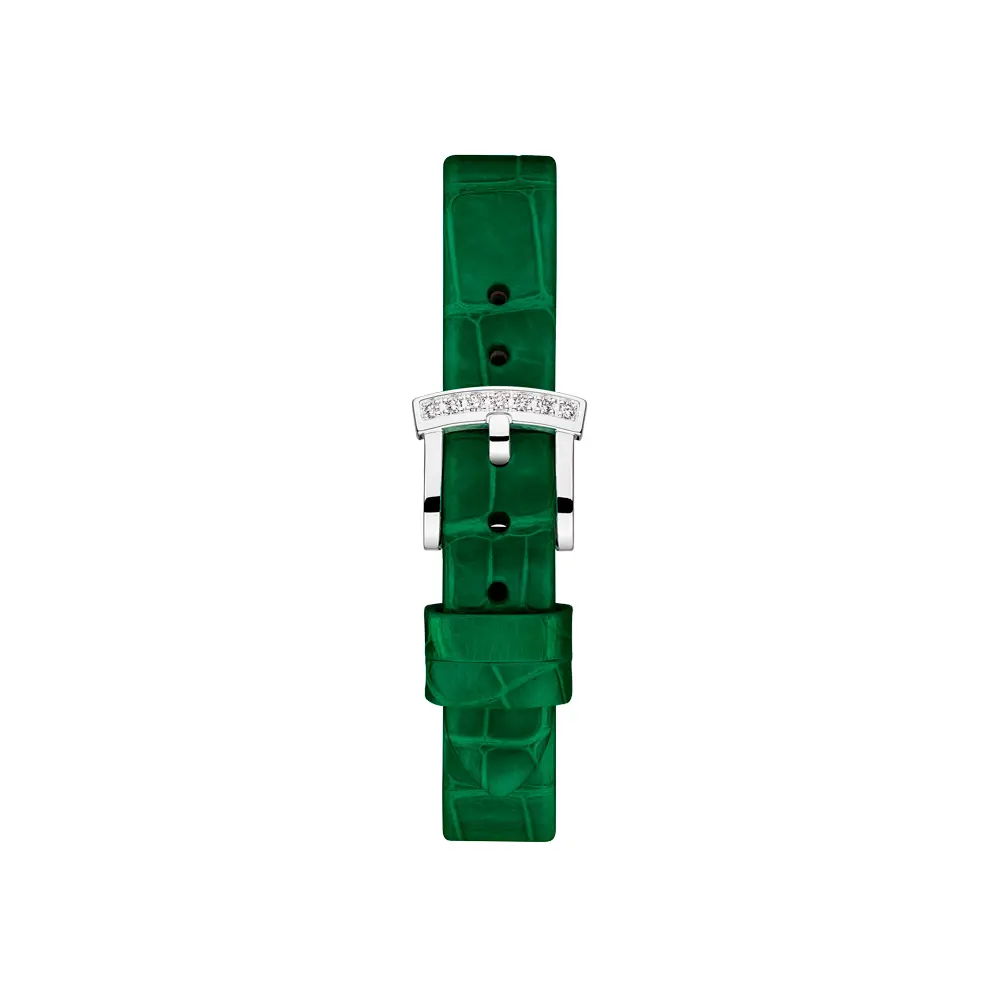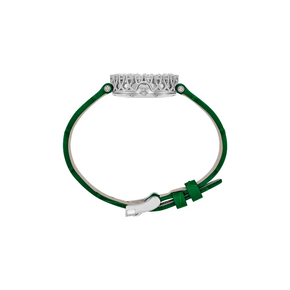 这枚腕表配备 亮绿色皮革表带,为白金与钻石的耀眼光辉注入一抹清新现代气息。对比强烈却又和谐,彰显独特个性。L'Heure du Diamant Round 13A178-1316 不仅是一枚腕表,更是一件象征永恒优雅与女性魅力的珠宝杰作。
