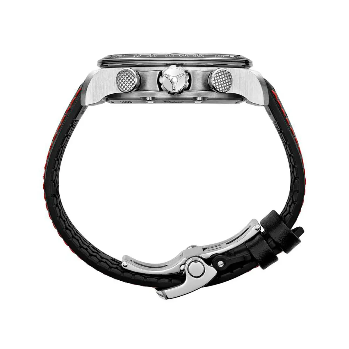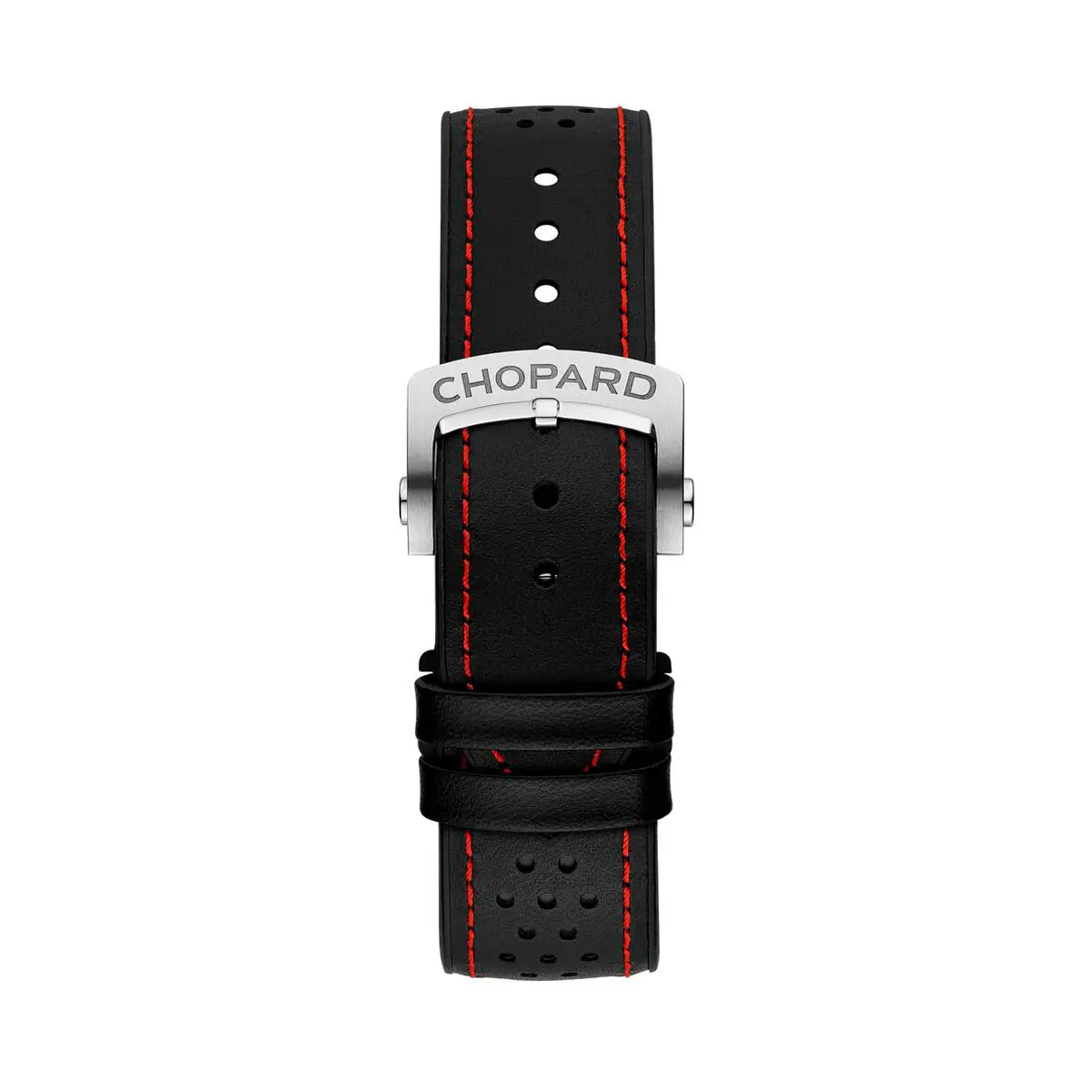 腕表搭载 获得 COSC 认证的自动机芯,拥有 48 小时动力储存,确保精准稳定。黑色打孔橡胶表带 灵感来自赛车轮胎,兼具舒适与个性。具备 100 米(10 ATM)防水性能,Chopard Mille Miglia 2021 Race Edition 是 性能、优雅与赛车激情的完美象征。