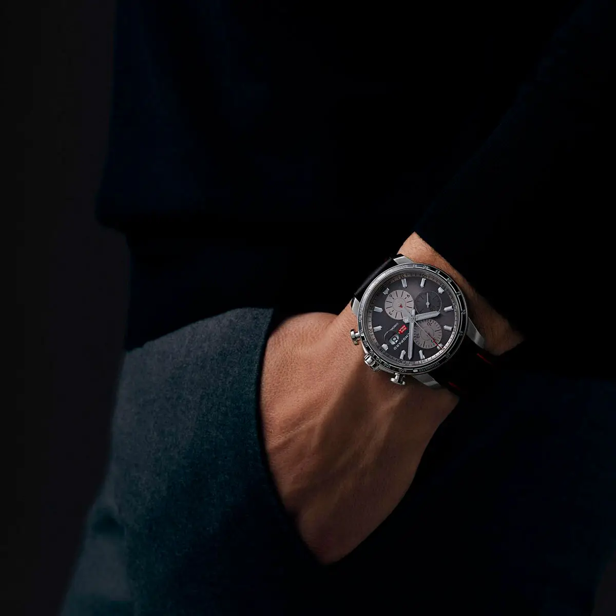 直径 44 毫米 的 精钢表壳 配以 钢与铝混合表圈,彰显强烈的动感特质。灰色表盘点缀红色细节,灵感源自赛车元素,搭配 防反光蓝宝石水晶镜面 提供极佳可读性。配备 计时功能、日期显示 与 夜光指针,兼具实用与风格。