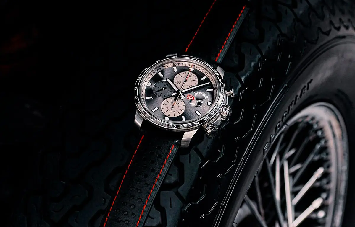 Mille Miglia 手表融合了老爷车的美学和高超的制表技术。设计通常参考一些细节,如车载仪表、让人联想到转速表的表盘或灵感来自 20 世纪 60 年代邓禄普轮胎的表带。