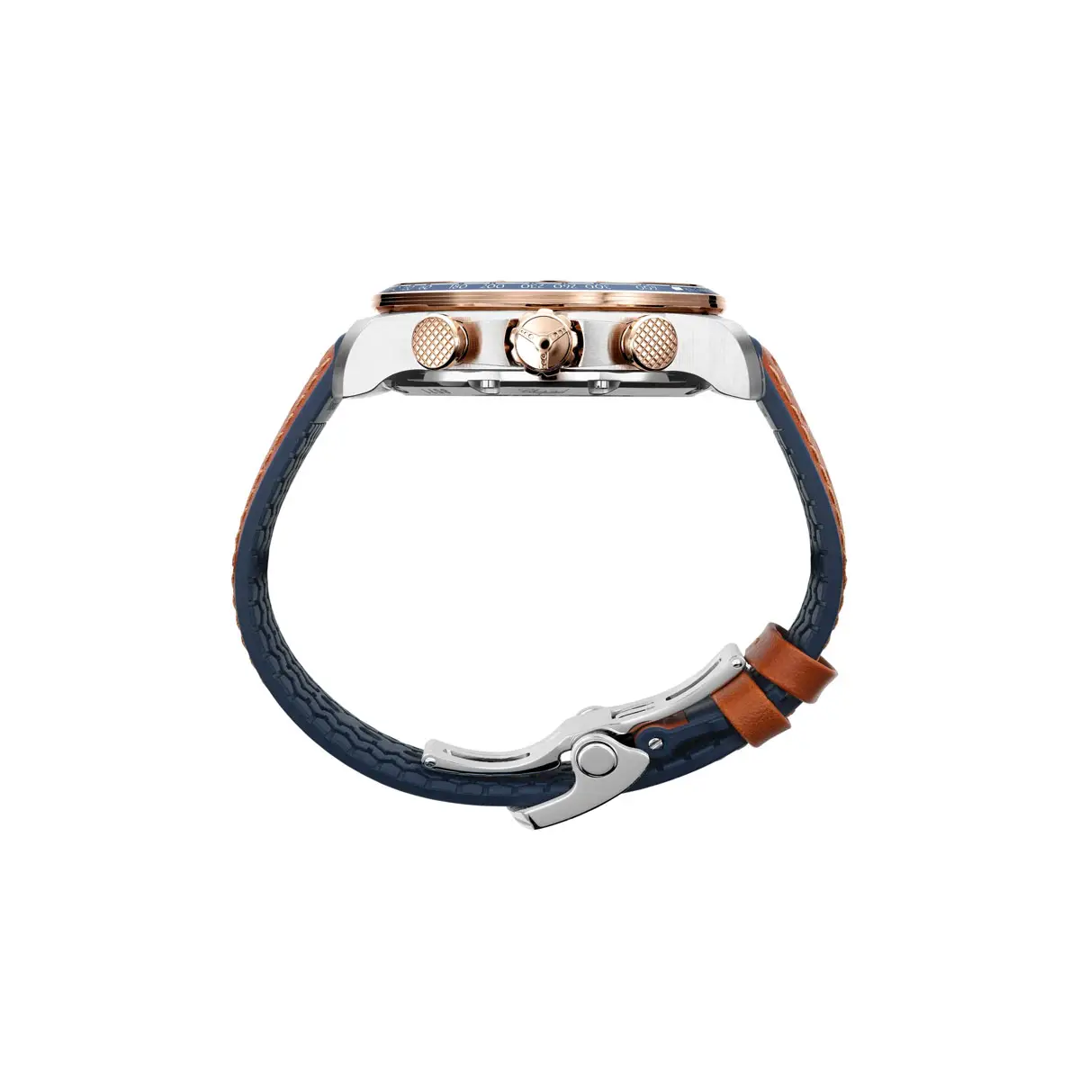 配以 棕色皮革加橡胶表带,其花纹灵感来自轮胎,搭配折叠扣使用舒适便捷,蓝宝石水晶镜面则保护表盘防刮。