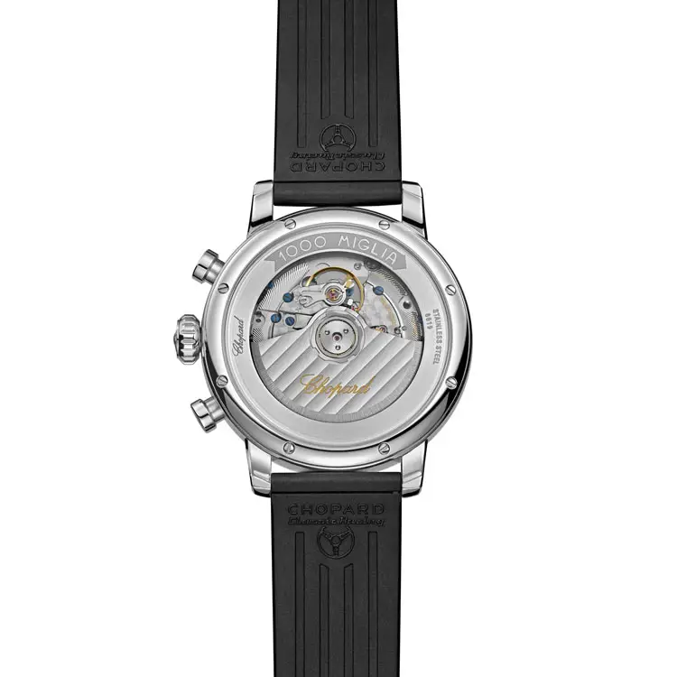 黑色橡胶表带搭配传统针扣设计,增添运动感,与整体外观完美融合。不锈钢表圈则进一步彰显出 Mille Miglia 系列源自传奇古董车赛的坚固而优雅的风格。
