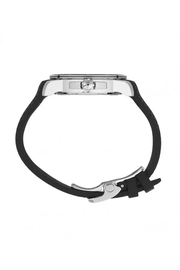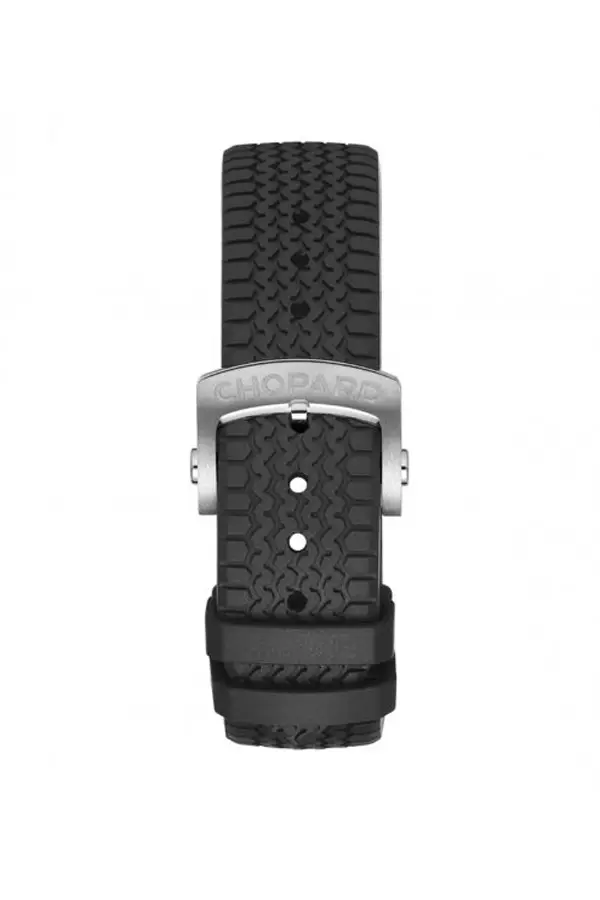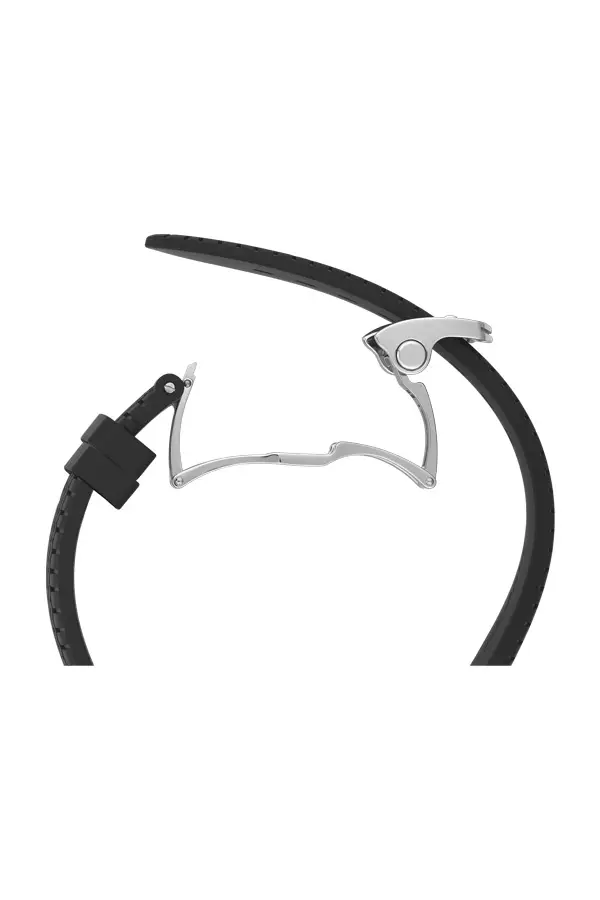 黑色橡胶表带灵感来源于 Dunlop 轮胎纹理,搭配折叠扣,佩戴舒适稳固。