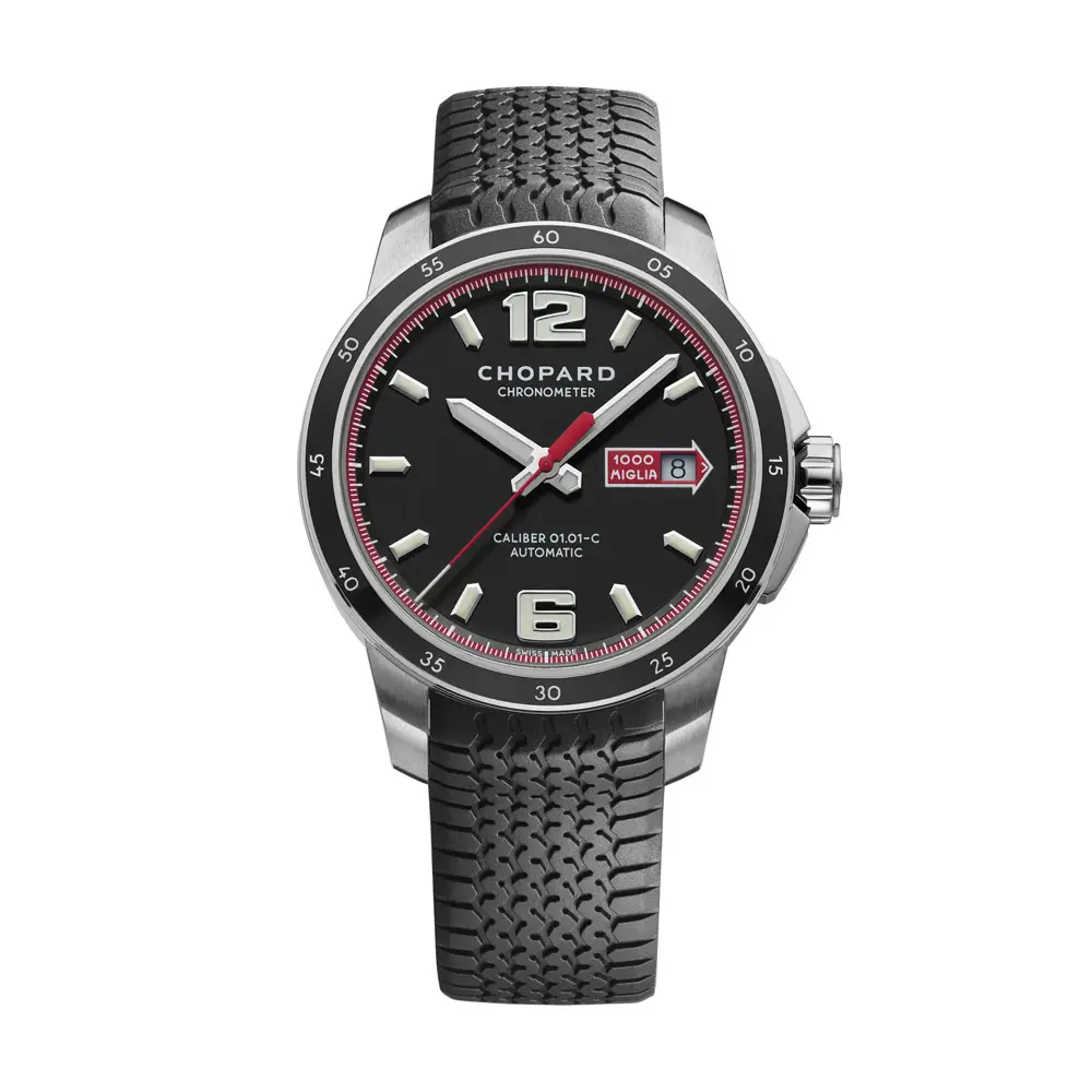 Mille Miglia GTS Automatic 是 Chopard 对经典赛车的致敬之作。43 毫米精钢表壳坚固耐用,搭配黑色表盘与日期显示窗,并由防刮蓝宝石水晶玻璃保护。