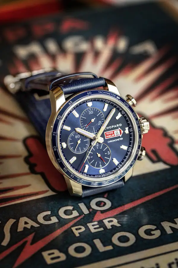 Mille Miglia 手表融合了老爷车的美学和高超的制表技术。设计通常参考一些细节,如车载仪表、让人联想到转速表的表盘或灵感来自 20 世纪 60 年代邓禄普轮胎的表带。
