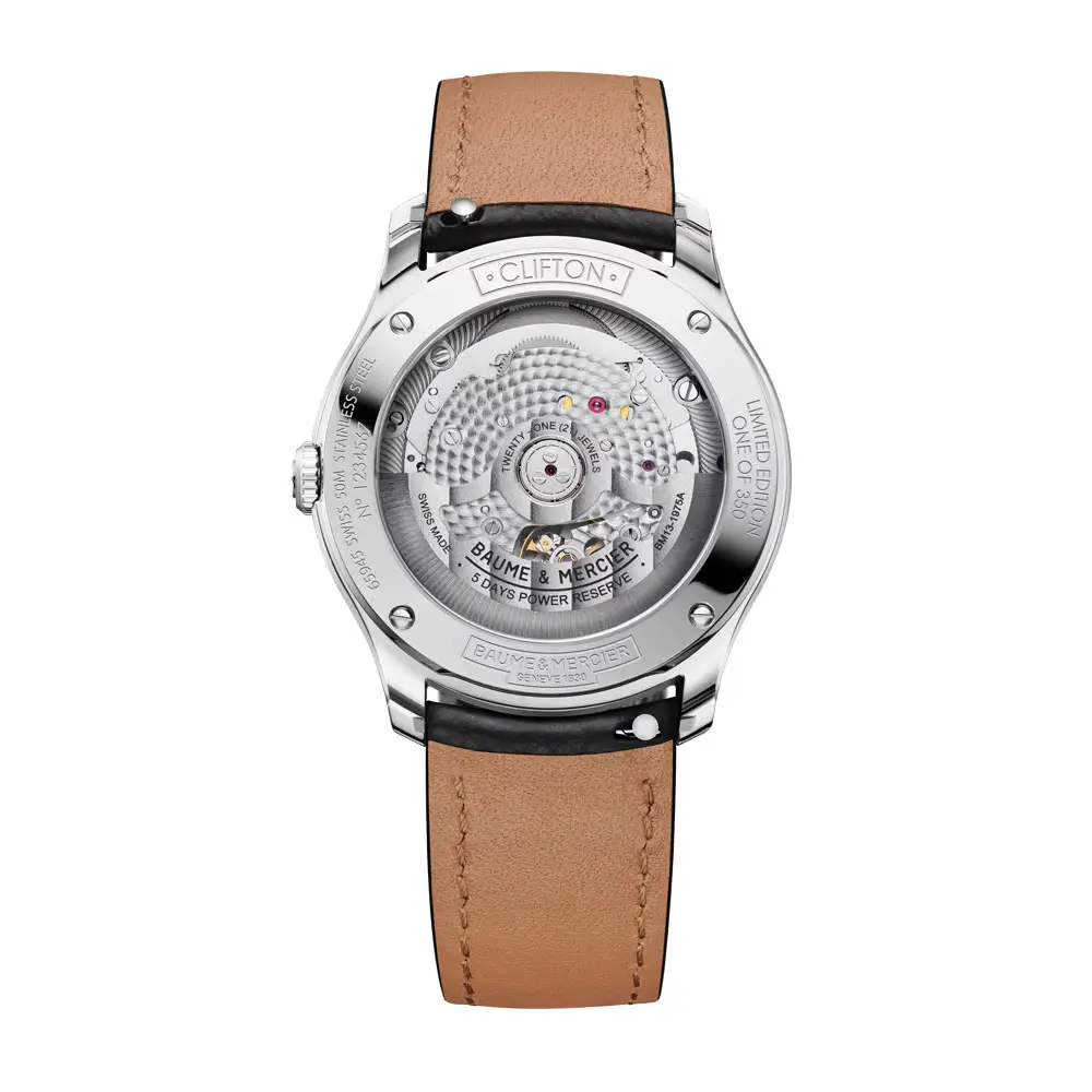 直径 39 毫米、高 11.22 毫米的拉丝精钢表壳搭载 Baumatic BM13-1975A 自动机芯,动力储备长达 120 小时。经过防眩处理的蓝宝石水晶玻璃表镜保护表盘,透明表盘让机芯的精密机械一览无余。