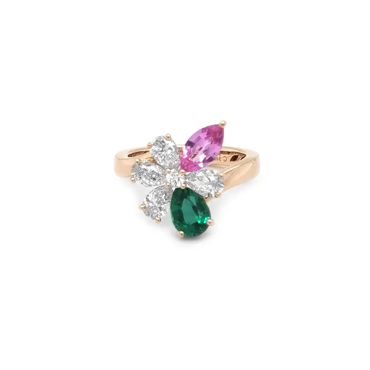 中央主石为天然绿色祖母绿 0.82 克拉,梨形切工(7.00 × 5.00 mm),并配天然粉色蓝宝石 0.68 克拉,马眼形切工(8.40 × 4.40 mm)。对比色调由钻石和声强化——4 颗天然白钻梨形切工,总重 1.19 克拉(4.65 × 3.50 mm),净度 VS、颜色 F,以及1 颗圆形钻石 0.06 克拉(直径 2.00 mm),净度 VS2、颜色 F。整件作品以丰富的色彩、原创性与奢华气质脱颖而出.