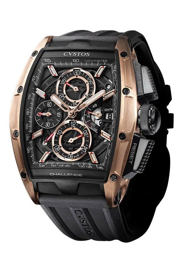 Chrono II 运动款系列男士手表,来自 Cvstos 品牌的创意工坊。该表款防水深度达 100 米,适合游泳爱好者佩戴。黑色橡胶表带与钛金属和 18K 玫瑰金表壳相得益彰。手表具有计时和日期显示等功能。