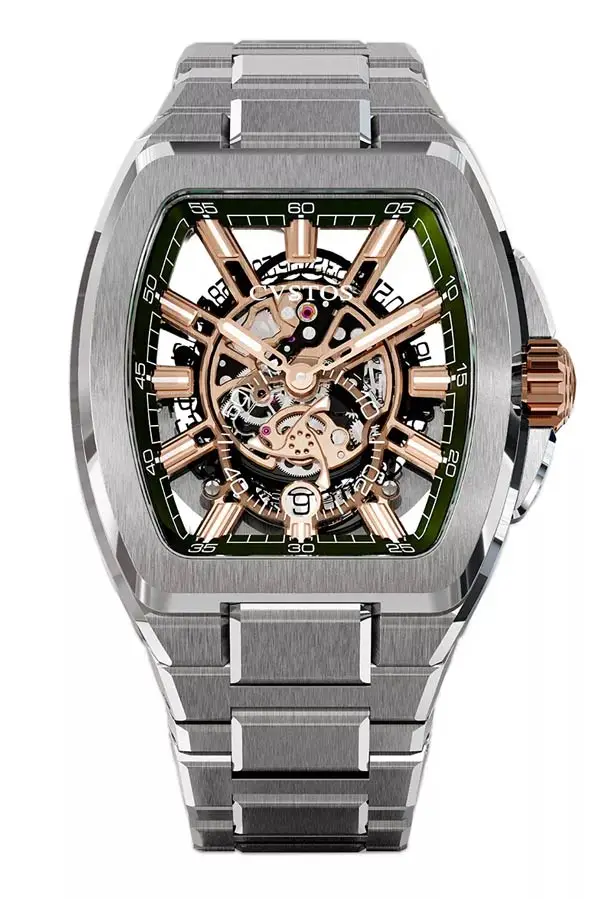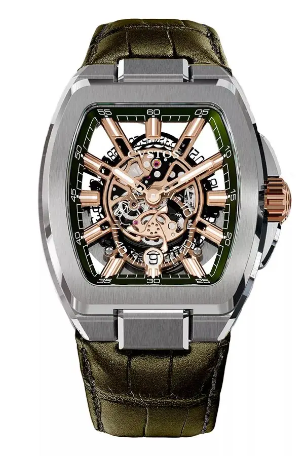 其 酒桶形钛金属表壳,尺寸为 51 x 42 毫米,兼具坚固感与轻盈佩戴体验。钛金属不仅耐用,还带来极高舒适度。蓝宝石水晶镜面保护下是迷人的 金色镂空表盘,展现 CVS410 SQLT 自动上链机芯 的复杂美学,具备 约 42 小时动力储存。