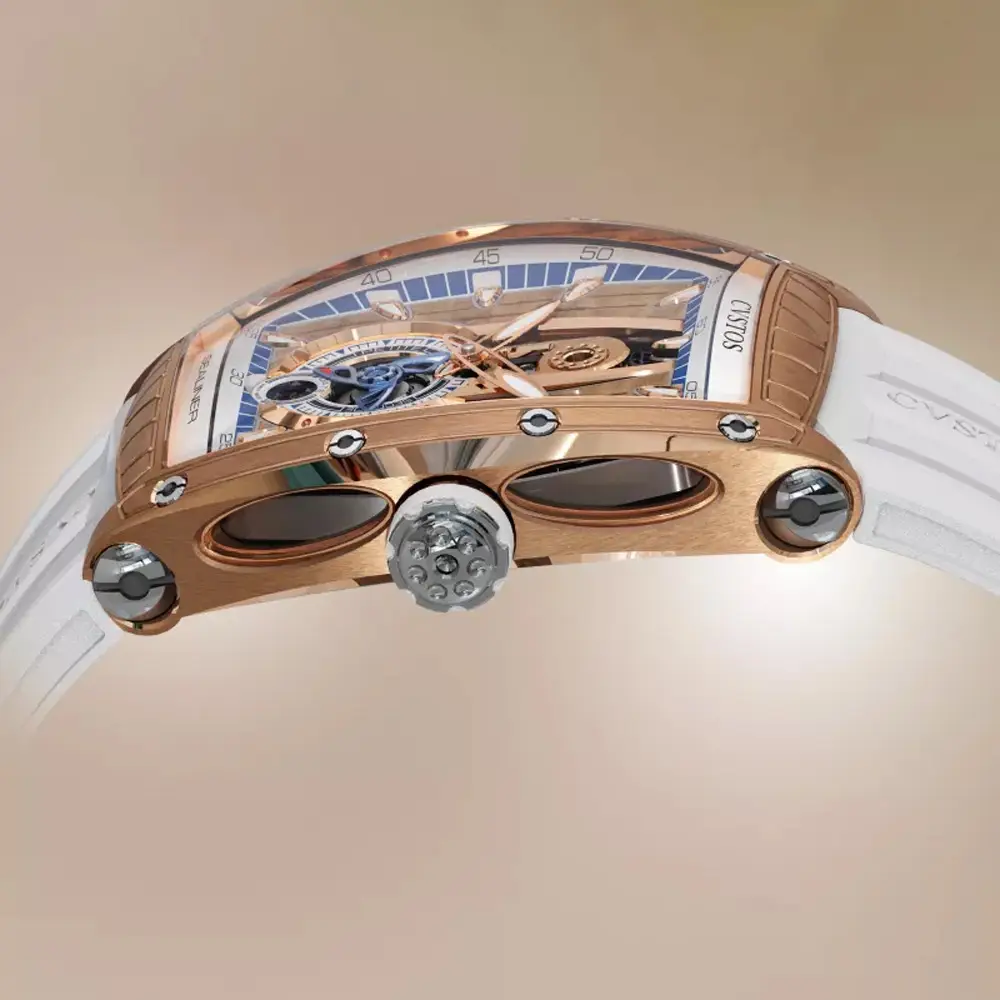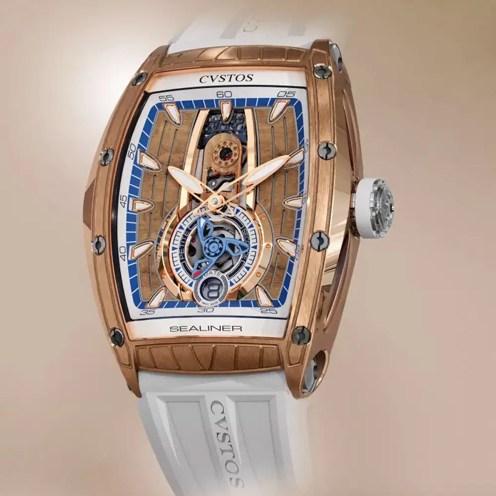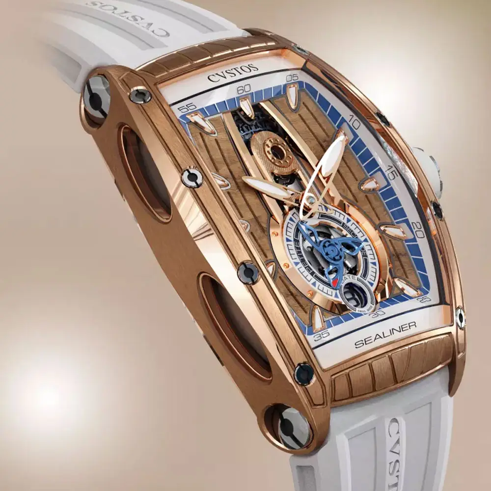 CVSTOS Sealiner PS Thirty6 5N 红金/钛金版融合现代制表美学与海洋灵感,是 Sealiner 系列的典型风格。其 47.2 × 36 mm 酒桶形表壳采用贵重的 5N 红金打造,并以钛金属细节增强坚固性与运动气质。蓝色镂空“Sky Blue”表盘展现内部精巧结构,层次分明,并搭配夜光指针与时标,读时清晰。