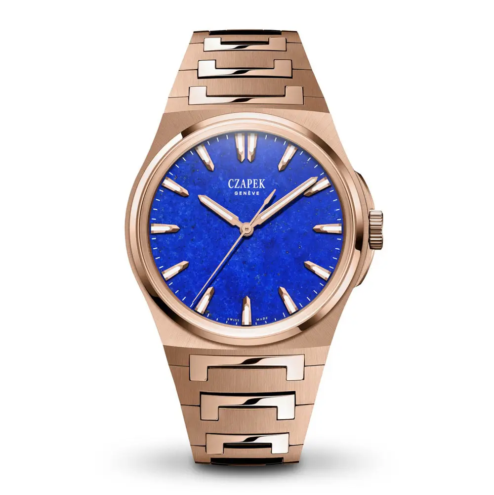 Czapek Antarctique Mount Erebus Lapis Lazuli 腕表将高级制表工艺与自然之美完美融合。由 天然青金石 打造的表盘呈现出深邃的蓝色,并点缀着细腻的金色黄铁矿纹理,使每一枚腕表都独一无二。直径 40.5 毫米的 18K 玫瑰金(5N)表壳 赋予腕表优雅气质,同时保留 Antarctique 系列标志性的运动风格。