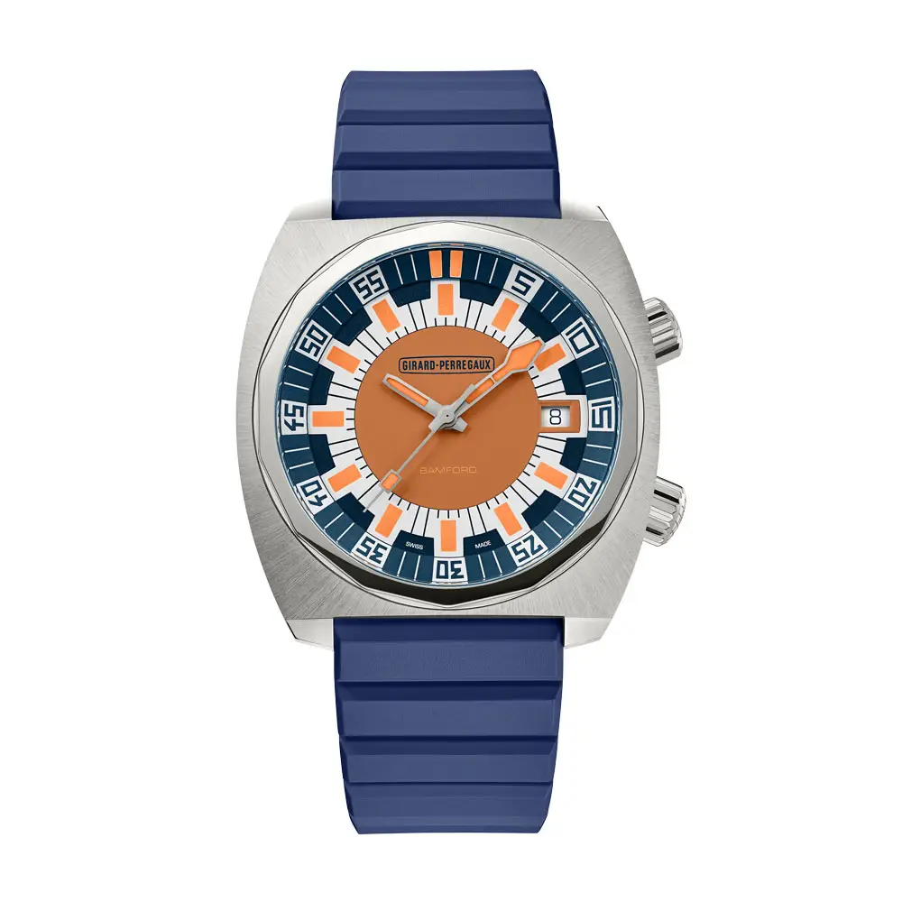 Girard-Perregaux Deep Diver 39500-21-3266-6CX是一款限量版腕表(350 枚),其设计灵感源自 1969 年的潜水表款,由Girard-Perregaux与 Bamford Watch Department 携手打造。该表款采用复古设计和现代工艺。