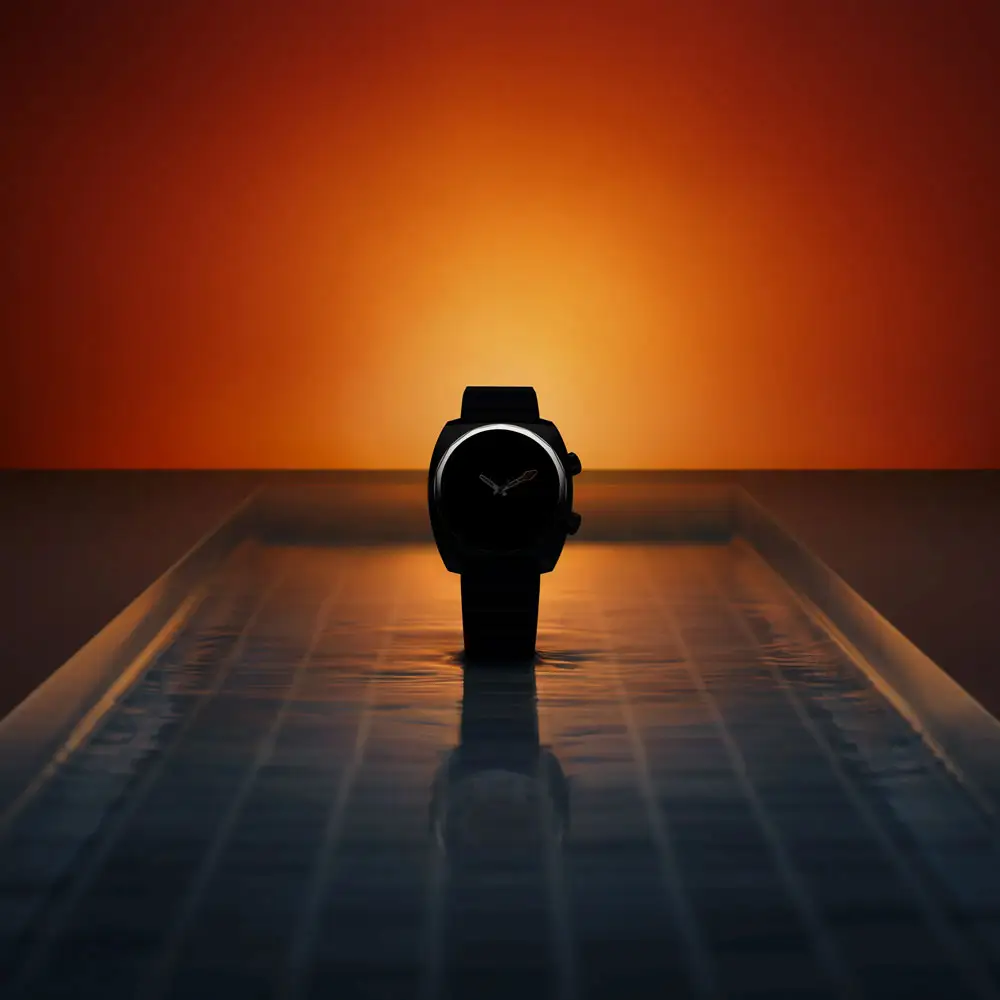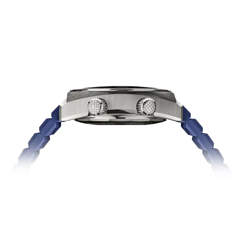 5 级钛金属表壳(40.3 × 38 毫米)轻巧耐用,防水深度达 200 米。表盘由橙色、蓝色和白色组成,带有独特的夜光元素。