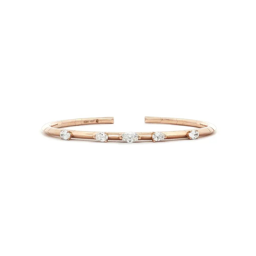 这款 18K玫瑰金硬质手镯 以袖口造型展现现代奢华与优雅。简约的金色线条镶嵌 5颗钻石,采用 椭圆形、橄榄形和水滴形切割,散发迷人光芒。