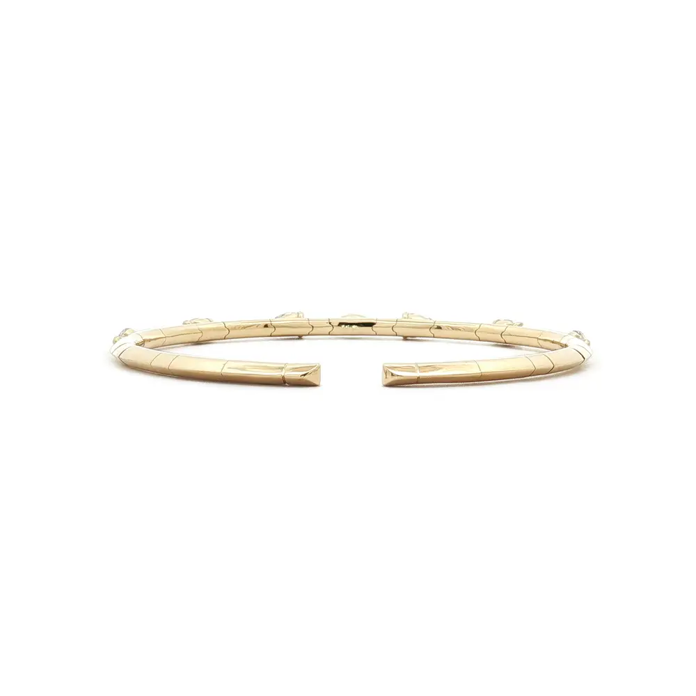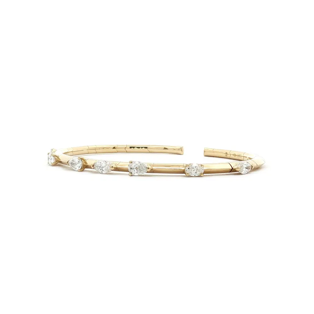 这款 18K黄金硬质手镯 以袖口造型展现永恒优雅与现代风格。简约的金色线条镶嵌 7颗钻石,采用 椭圆形、橄榄形和水滴形切割,折射迷人光芒。
