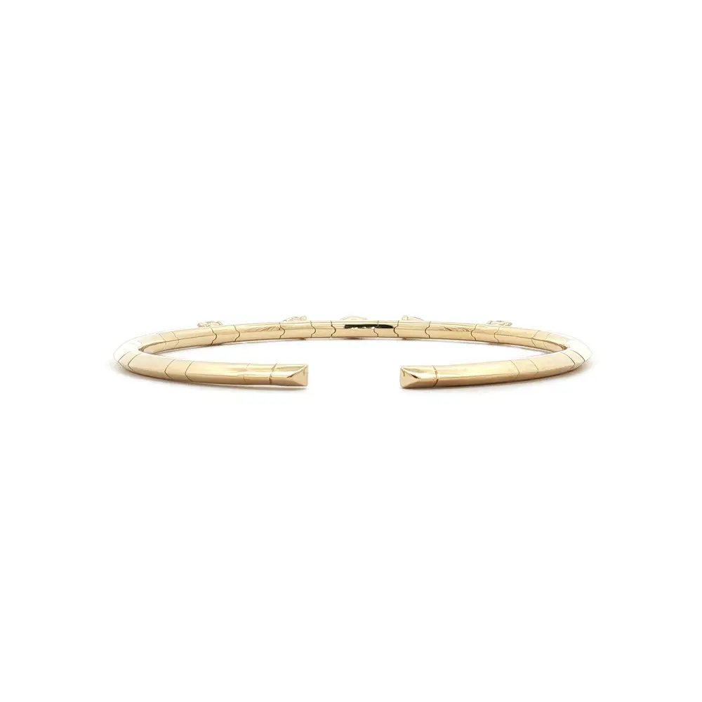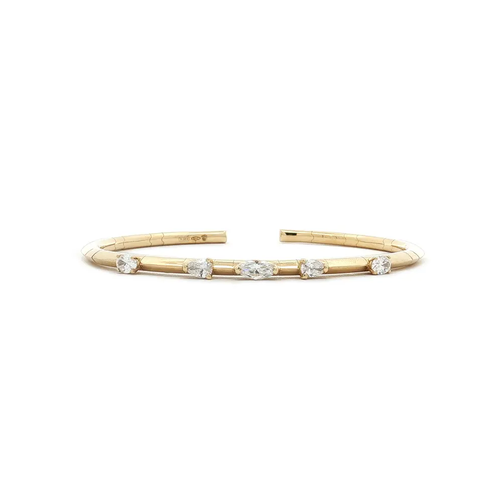 这款纯 18K 黄金袖口式手镯体现了现代优雅和精致奢华。简约的黄金线条上点缀着五颗不同寻常形状的钻石--椭圆形、榄尖形和水滴形,共同营造出独特的光影效果。
