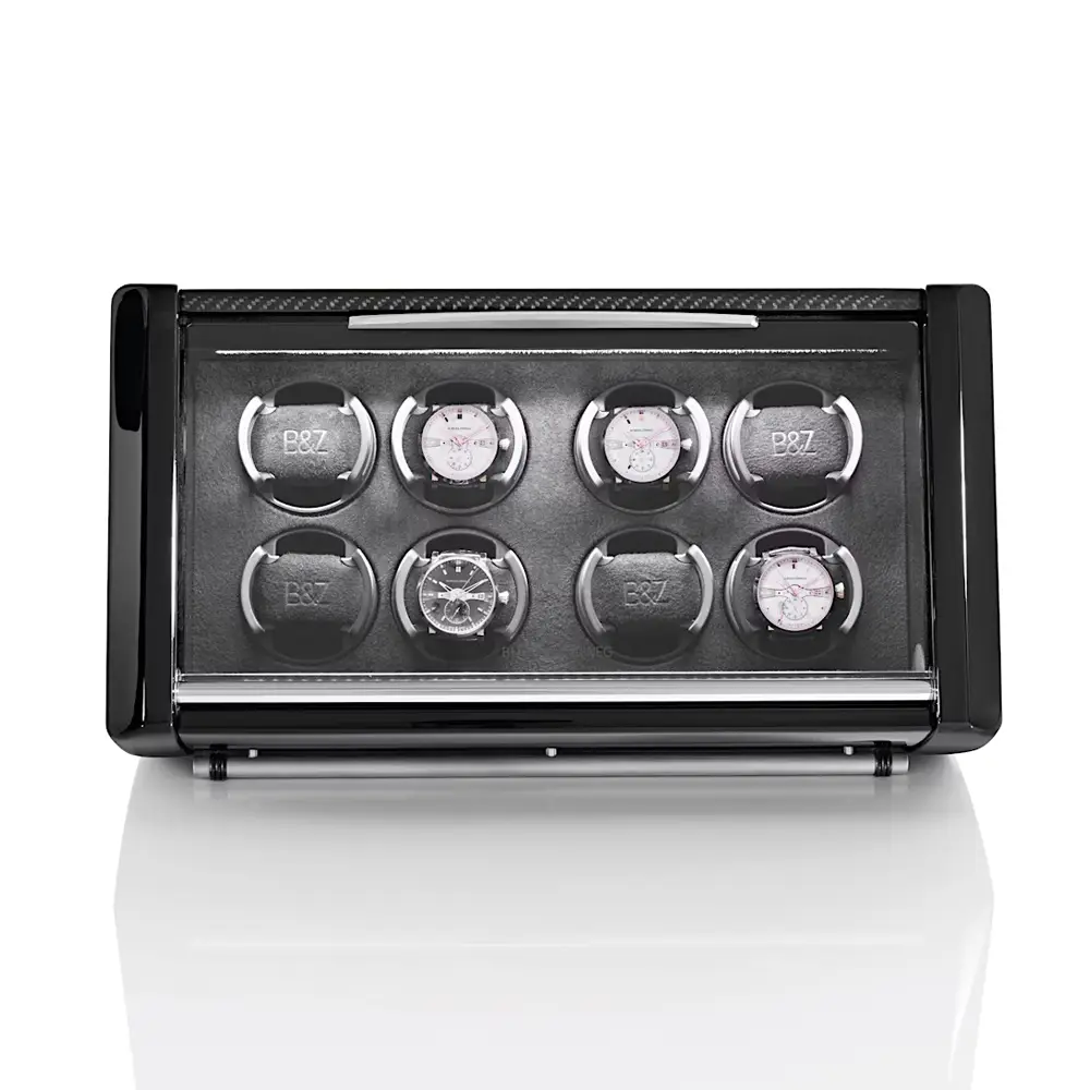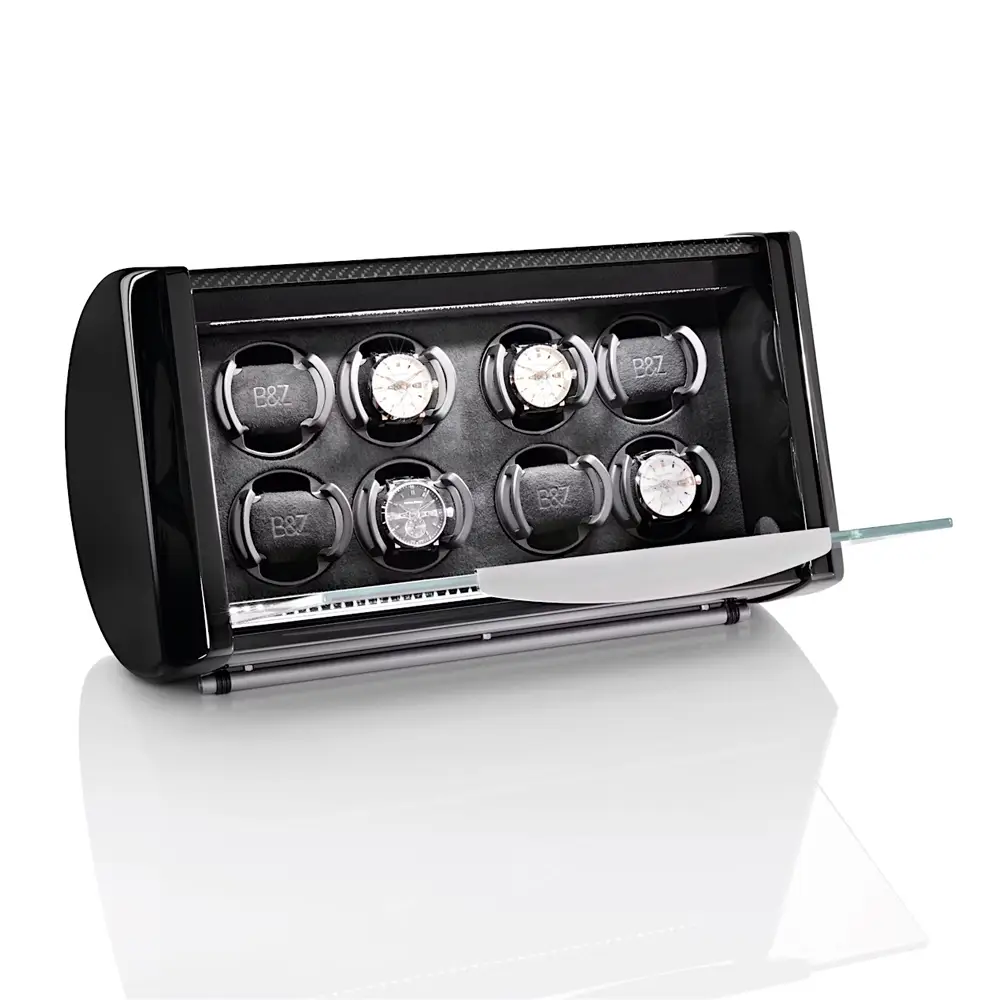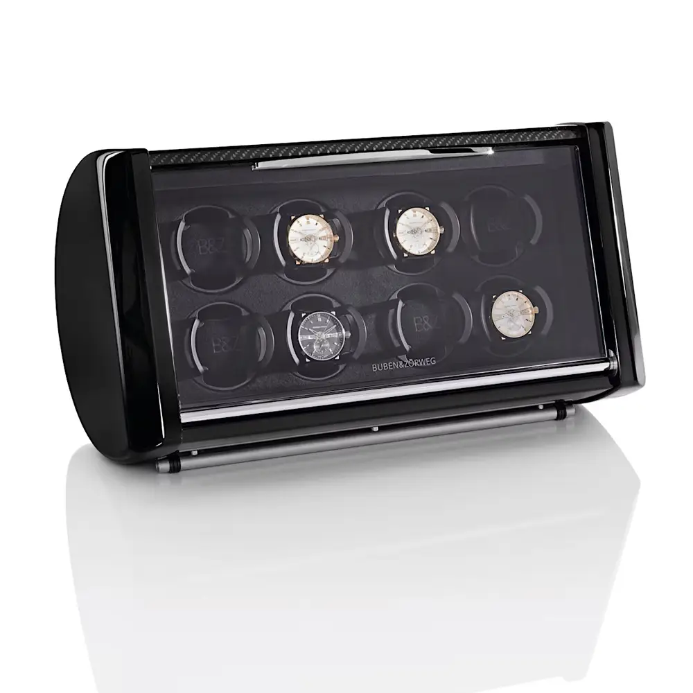 Buben & Zorweg SPIRIT 8 上链盒完美融合了奢华设计、技术精度与精湛工艺。它可容纳多达 8 枚自动腕表,采用拉丝铝制机身,配以 碳纤维、鳄鱼皮或马卡萨木 等高端细节装饰。前方安全玻璃窗让您在设备运转时仍能欣赏腕表收藏,内部柔软的天鹅绒衬里为腕表提供周全保护。