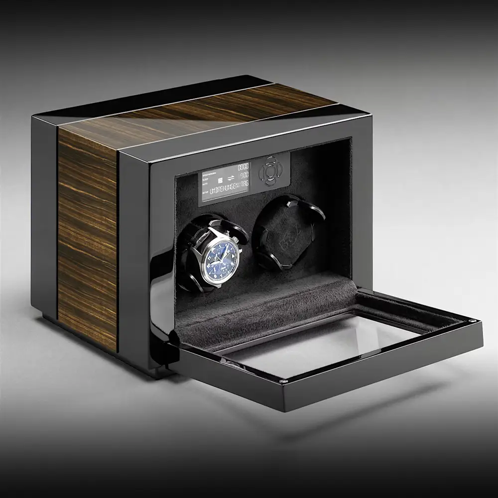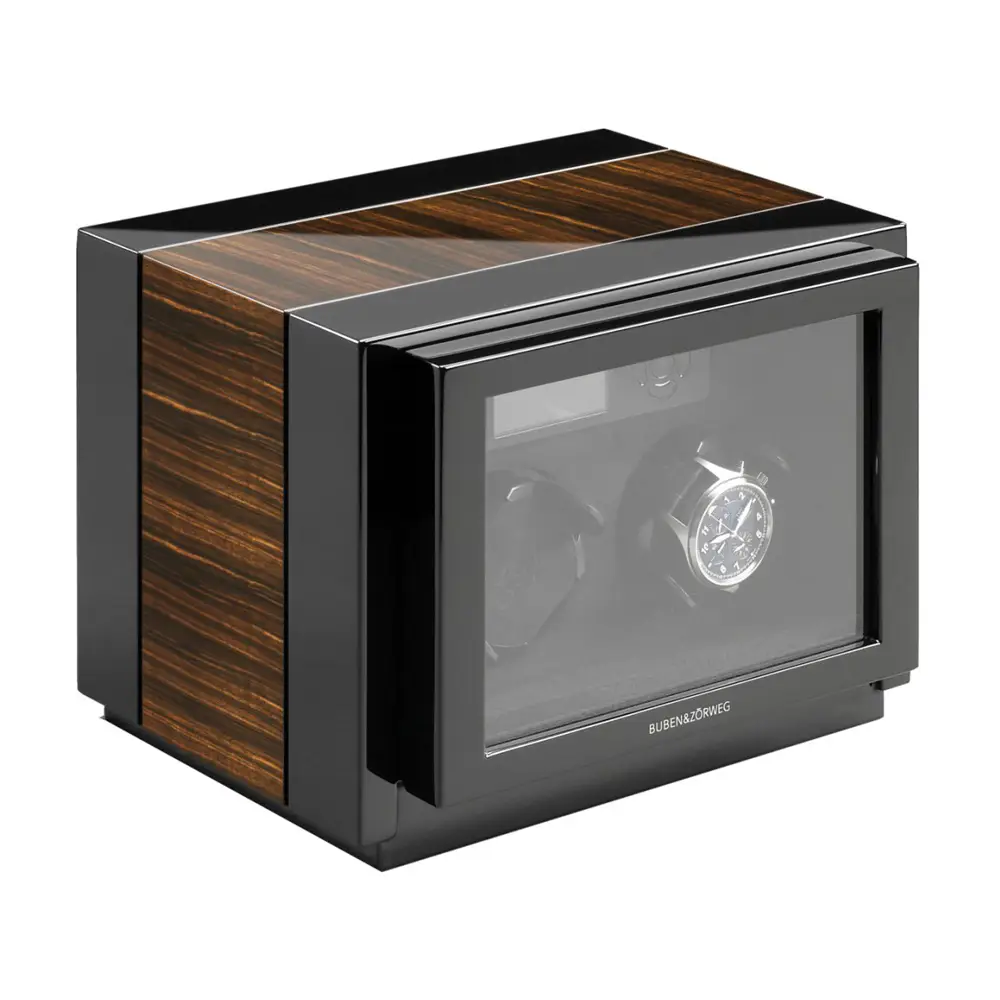 Buben & Zorweg VANTAGE 2 Macassar 上链盒完美结合了德国精密工程与永恒奢华。此款独家型号可容纳 两枚自动腕表,采用高光 黑色钢琴漆 搭配 马卡萨木饰面,展现优雅而精致的设计。前方 安全玻璃盖 让腕表得以优雅展示,而 安全锁系统 与柔软 天鹅绒内衬 提供极致保护与舒适收藏空间。
