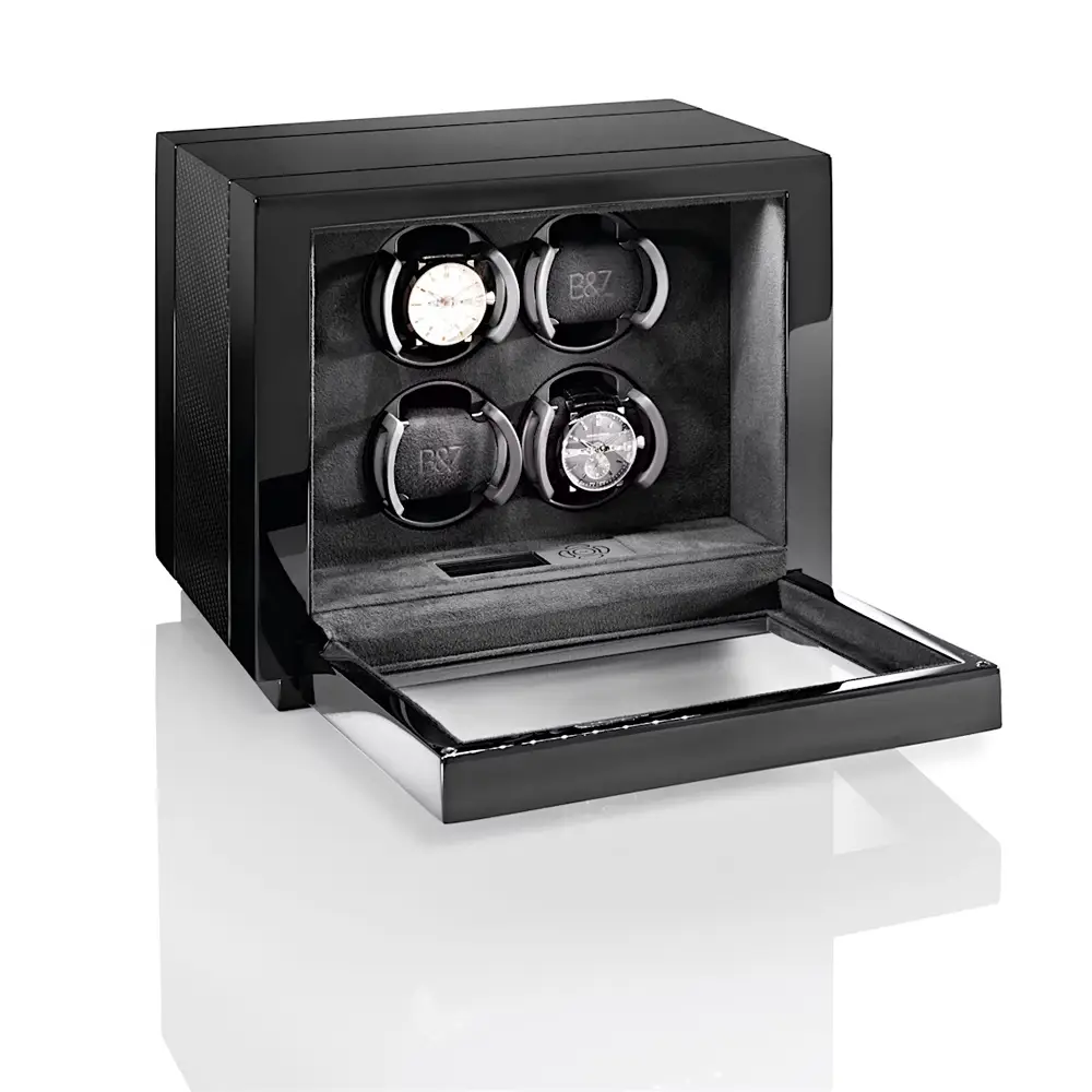 Buben & Zorweg VANTAGE 4 Carbon 上链盒为安全且优雅地存放多达 4 枚自动腕表 提供奢华方案。其现代设计将高光 黑色钢琴漆 与 碳纤维细节 相结合,展现出运动感与优雅气质。玻璃前盖 让您可以时尚展示腕表,而 安全锁装置 与精湛工艺确保收藏得到最佳保护。