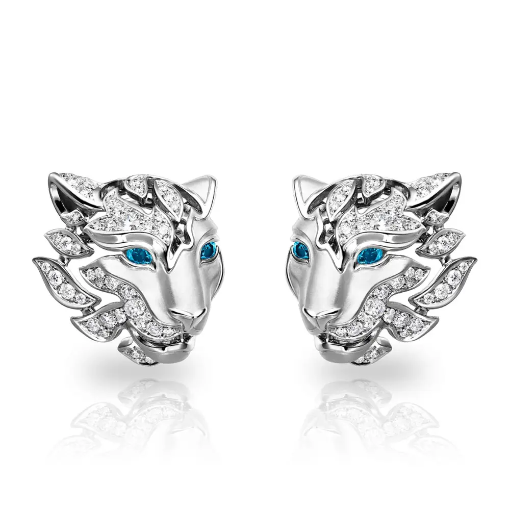 饰有88 颗明亮型车工钻石,总重0.81 克拉,为图案增添了光彩和精致。总重 0.23 克拉的醒目蓝钻作为两只野兽的眼睛,使它们看起来充满力量和个性。这对耳环看起来自信满满,同时又不失精致,适合日常和正式场合佩戴。