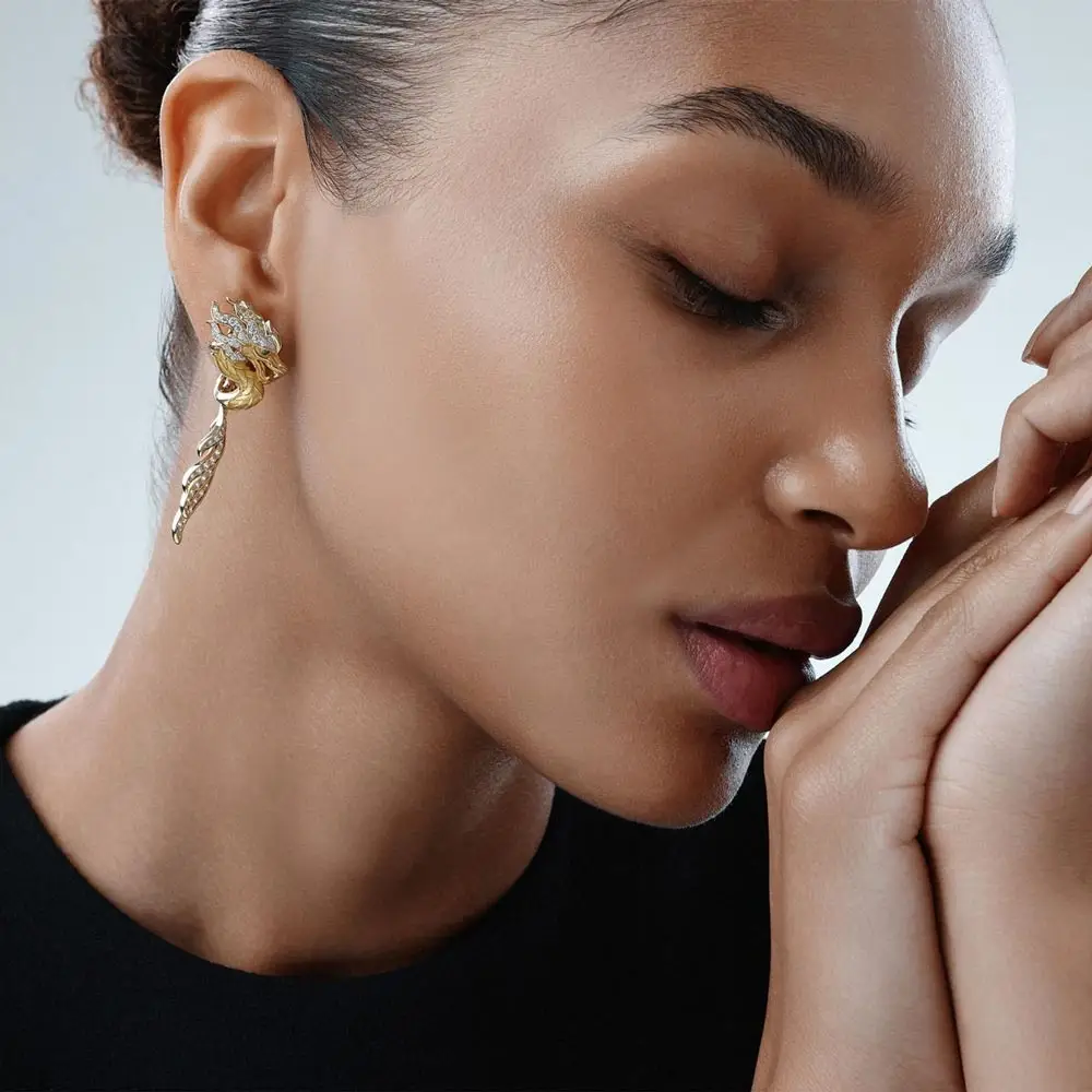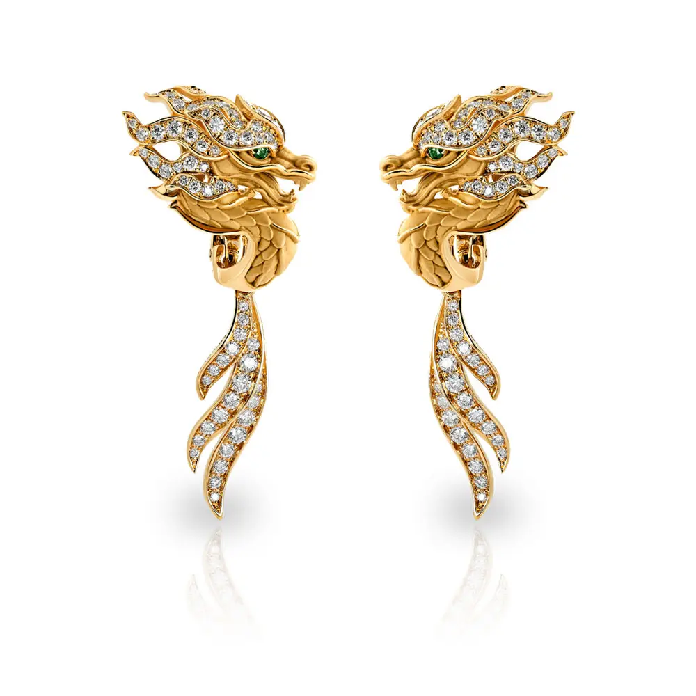 四颗总重 0.07 克拉的绿钻是一个引人注目的细节,它们是龙的眼睛,赋予了这款珠宝独特的外观--生动、有力、不可错过。龙鬃毛 "的优美弧线形成优雅的向下延伸,使耳环看起来动感十足。