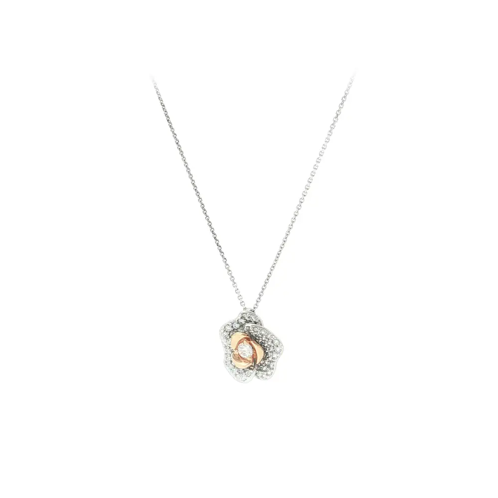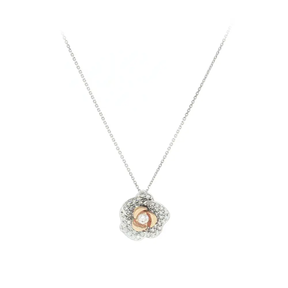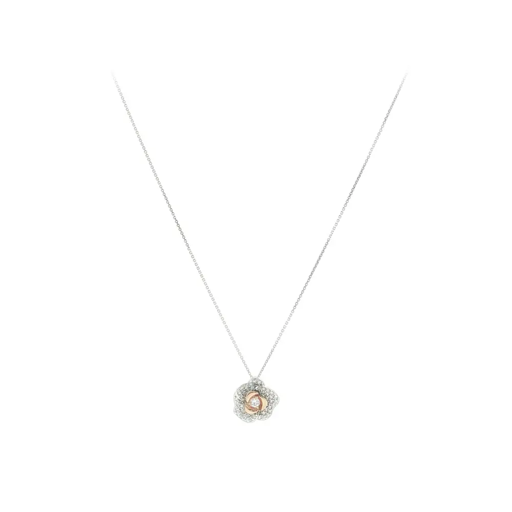 这款白金花朵吊坠项链,镶嵌锆石,设计精致浪漫。闪耀的锆石增添迷人光彩,凸显细腻的花朵造型,优雅且经典。
