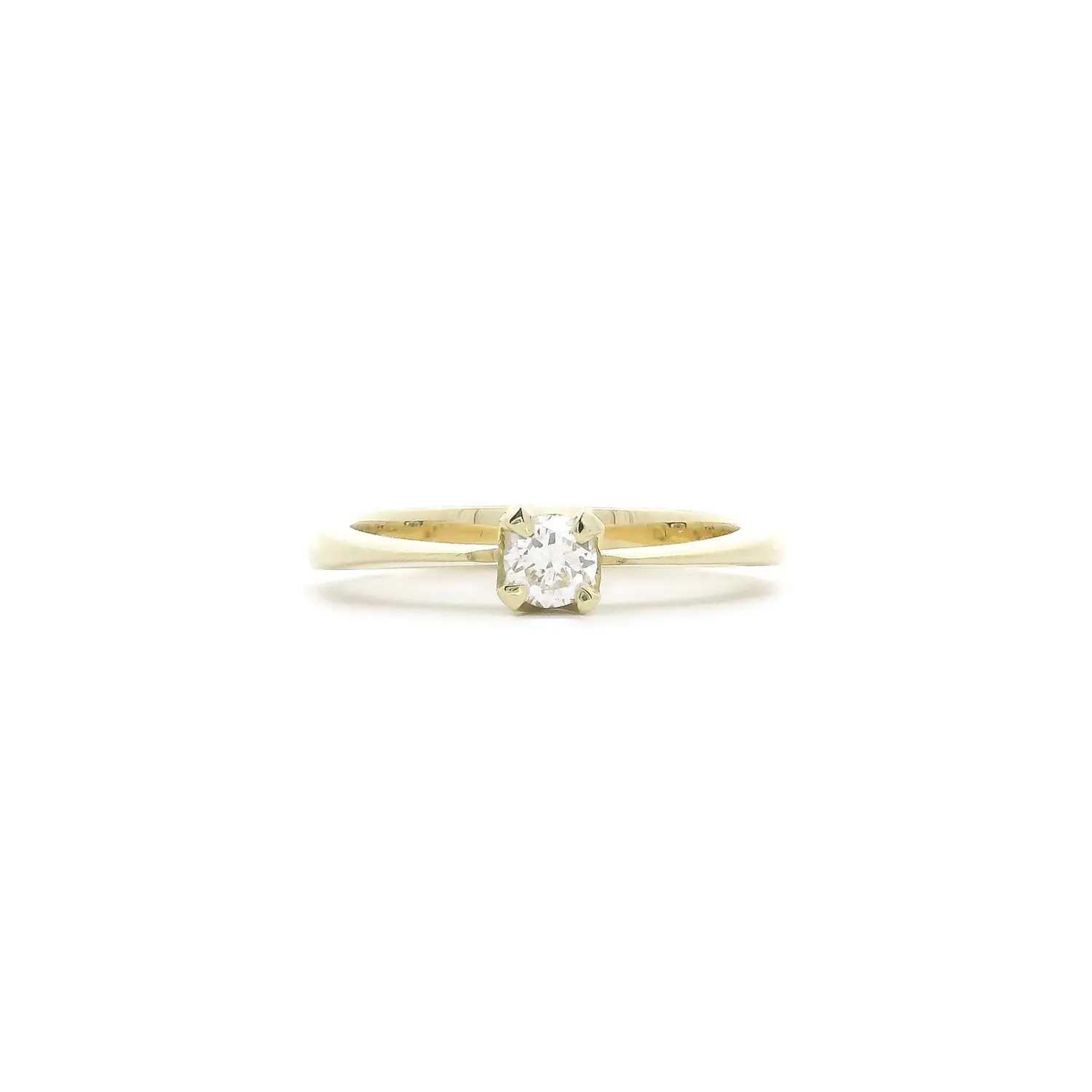 这款黄金订婚戒指融合了经典之美与现代简约。中央镶嵌一颗0.18 克拉明亮式切割钻石,闪耀着自然光芒与完美折射。