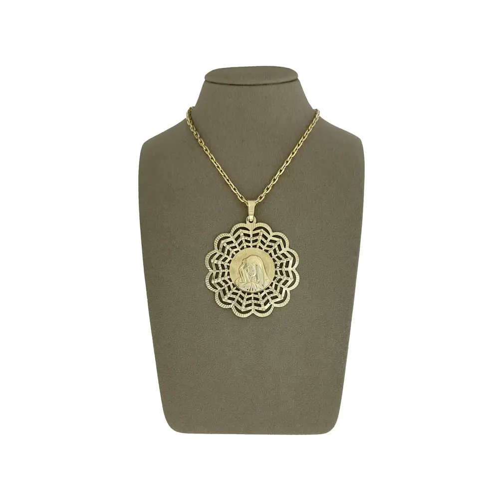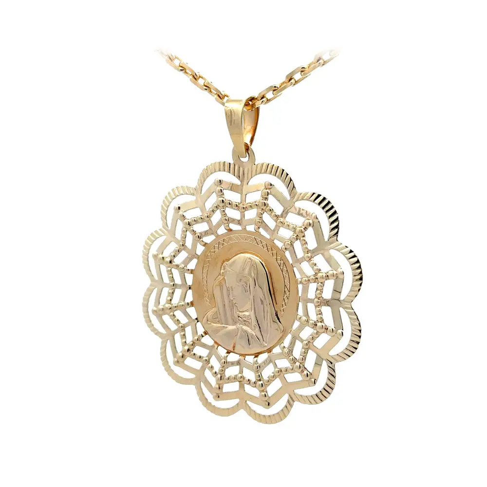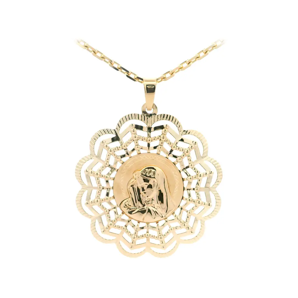 这款华丽的吊坠以14K黄金(585/1000)精制而成,中心刻有圣母玛利亚的浮雕形象,展现了精湛的金匠工艺。中央光滑抛光的圆环将圣像衬托得更加庄重,而外围的镂空花边设计犹如盛开的花朵或曼陀罗,极具视觉层次感。